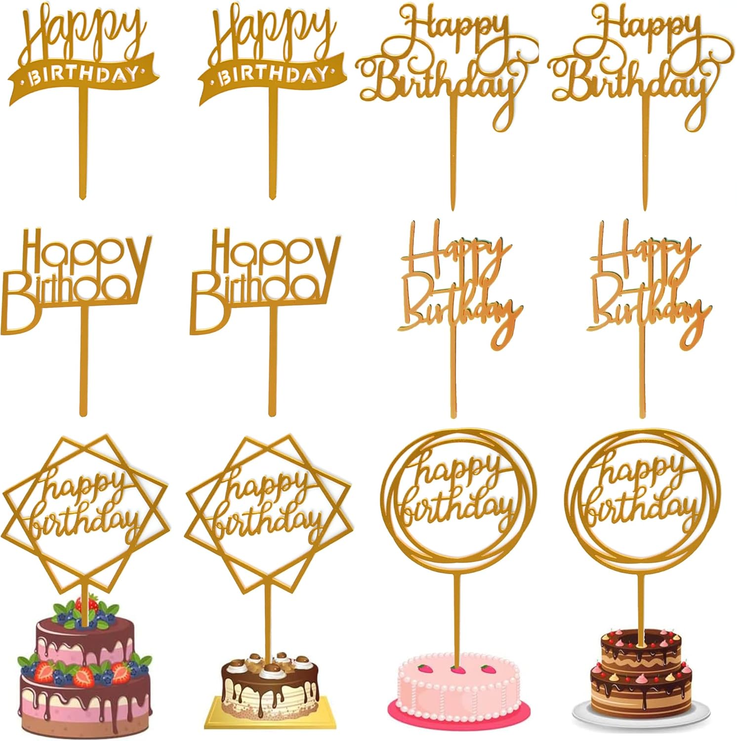 12 Pack Multi Styles Birthday Cake Topper Set, Acrylic Cake Bunting Decor Birthday Cake Picks Party Decorations Supplies(Gold)