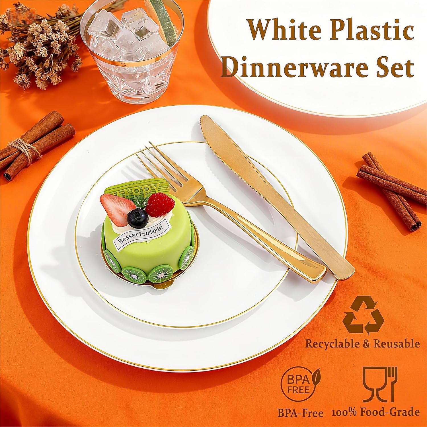 Festiva 176Pcs White and Gold Plastic Plates - White with Gold Rim Fall Dinnerware Set - 25Guest include Plates Cups Cutlery Napkins for Fall Party&Wedding& New Year&Thanksgiving