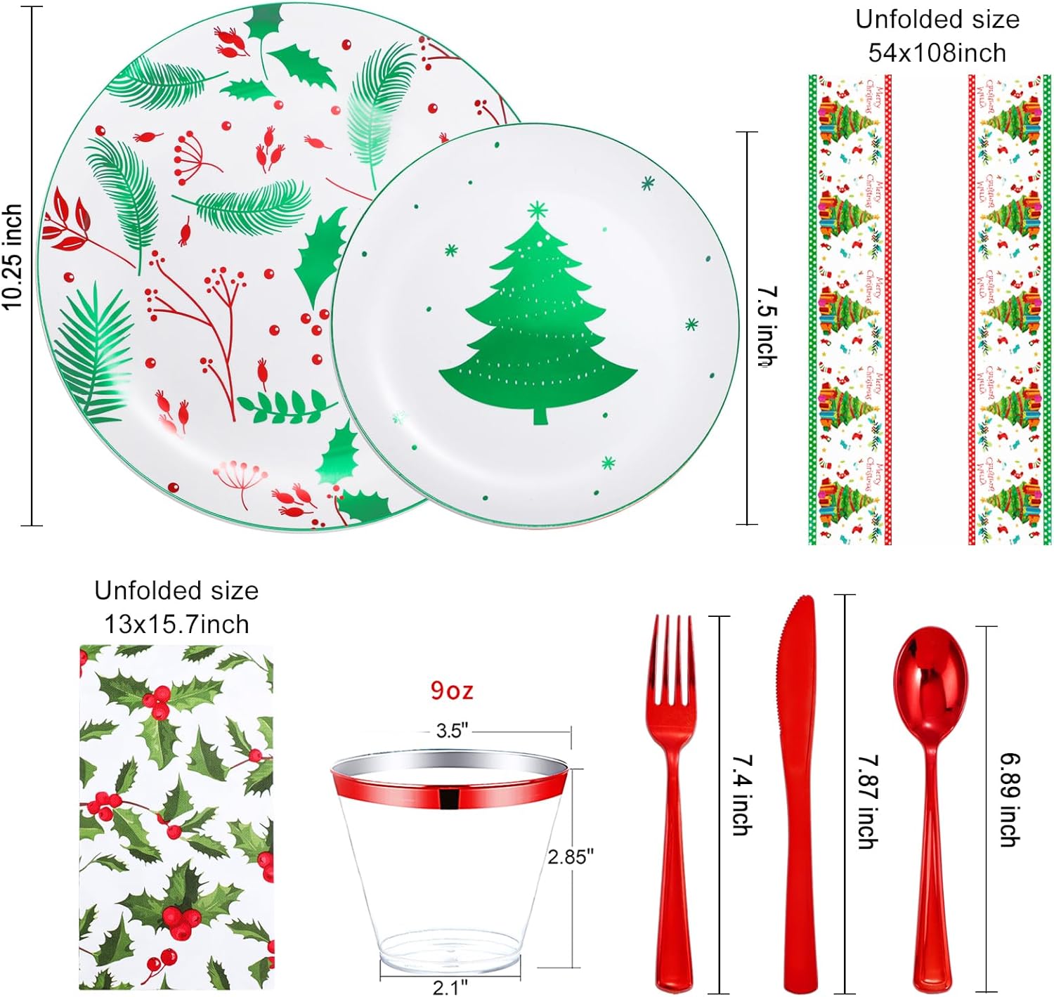 • 【CHRISTMAS EXCLUSIVE DESIGN】:Unique green and red plastic plates with green "Christmas tree" pattern, consisting of 25 dinner plates, 25 dessert plates, 25 sets of Christmas plastic silverware, 25 plastic cups, 25 holly berry napkins 13*15.7 inches (unfolded size), 1 plastic Christmas tree tablecloth 54*108 inches (unfolded size). These sparkling holly berry plates and printed holly berry napkins are full of Christmas cheer and add elegant decorations to your party.