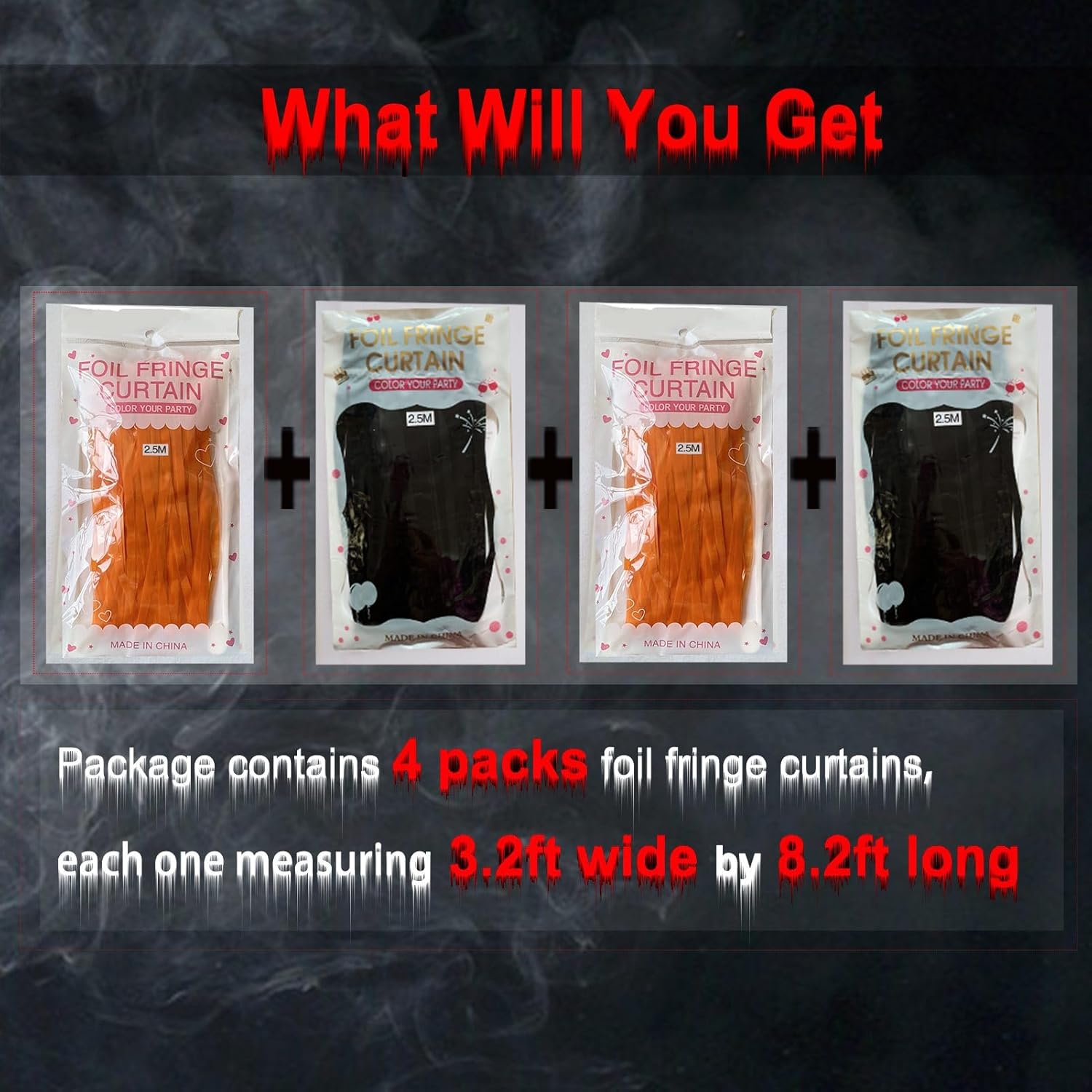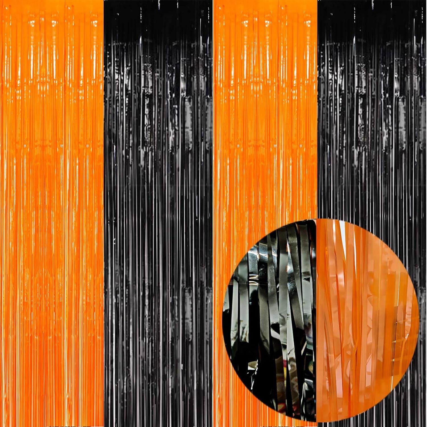Foil Fringe Curtains-4 Pack of 3.2x8.2ft Orange Black Foil Fringe Curtains for Birthday Halloween Photo Backdrop Party Decorations, Orange and Black Party Streamers for Photo Booth Props