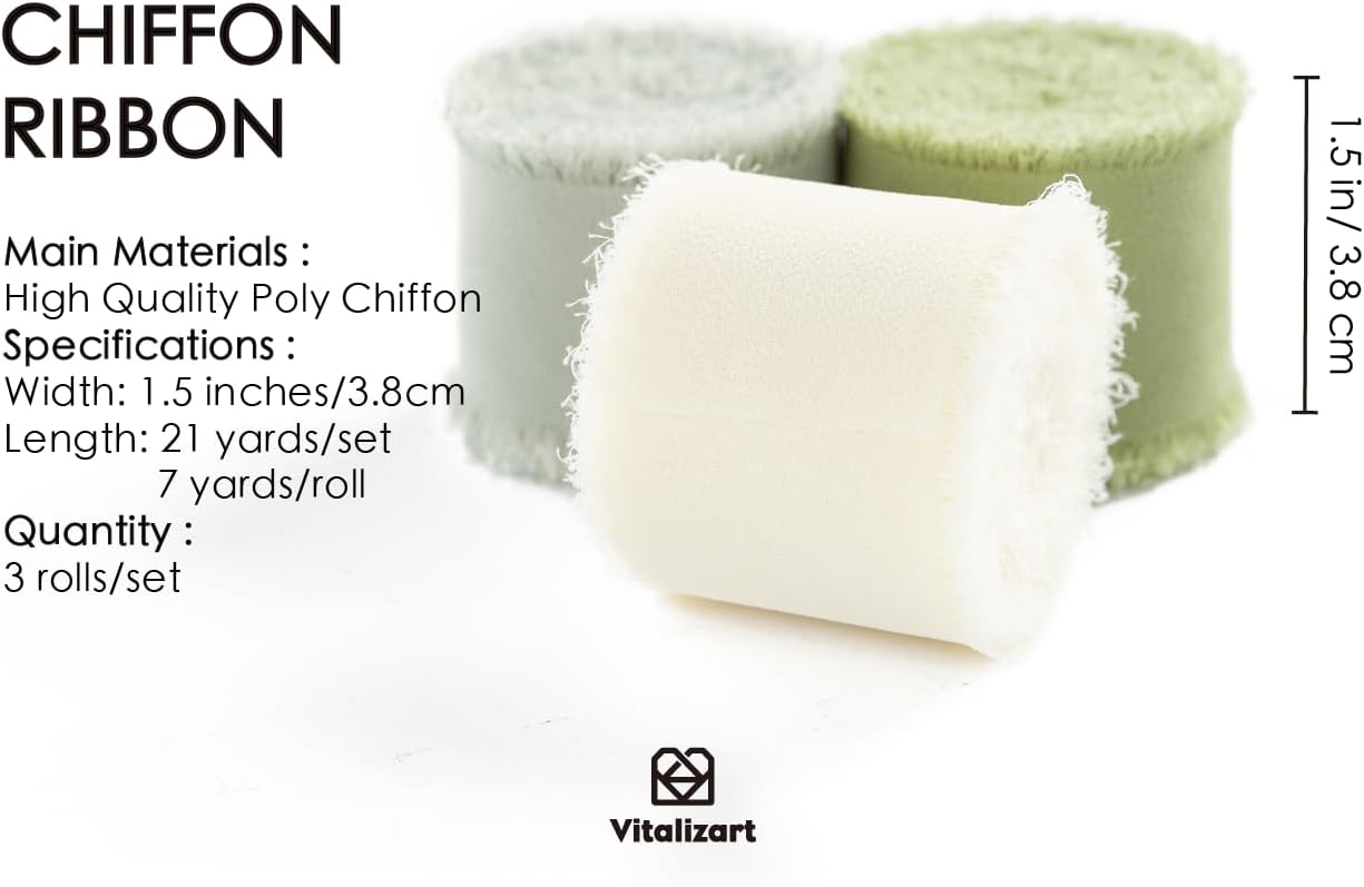 Vitalizart Sage Green Handmade Chiffon Silk Ribbon Fringe 1.5" x 21 Yd Frayed Edges Ribbons for Wedding Invitations Bridal Bouquets Gifts Wrapping Crafts Holiday Party Decorations