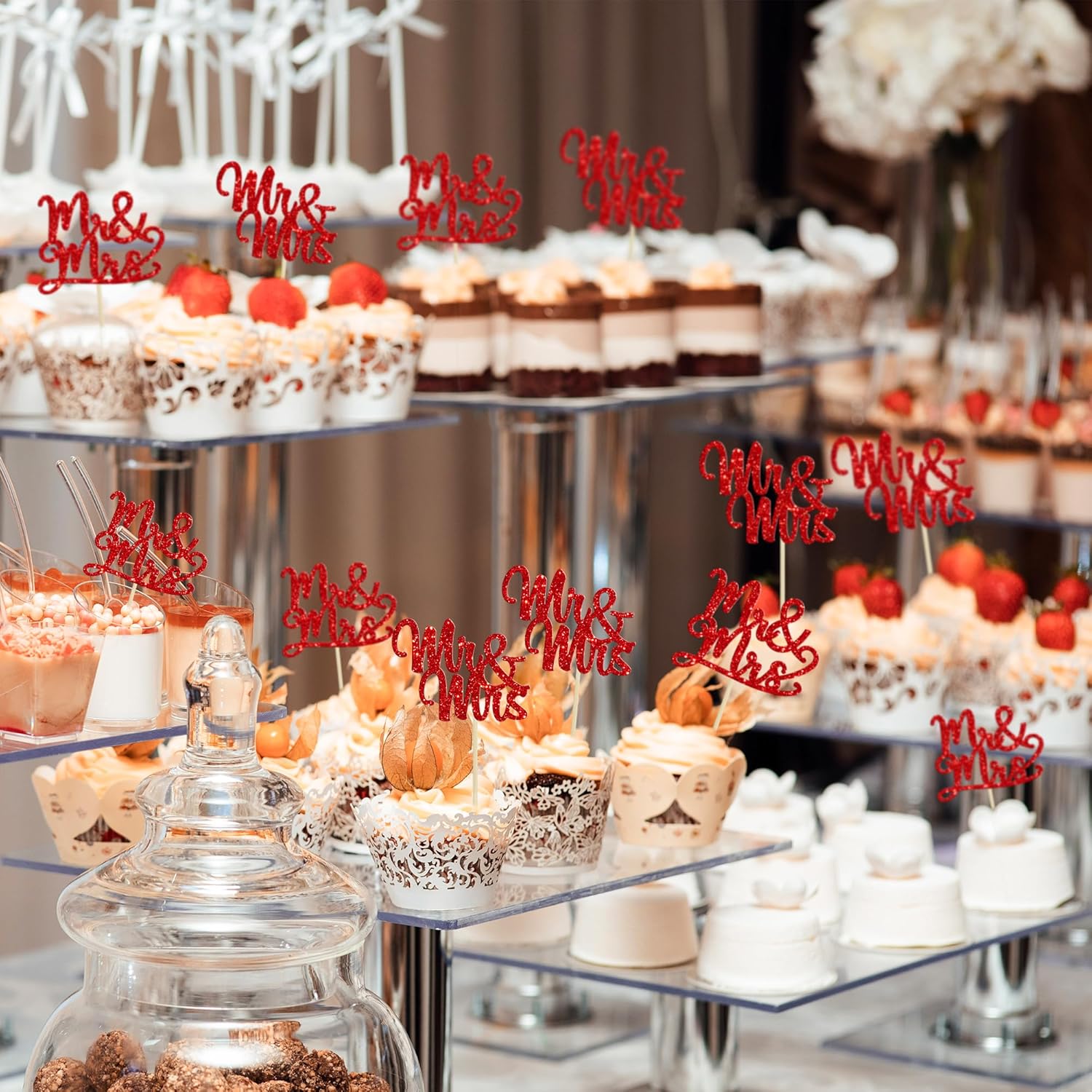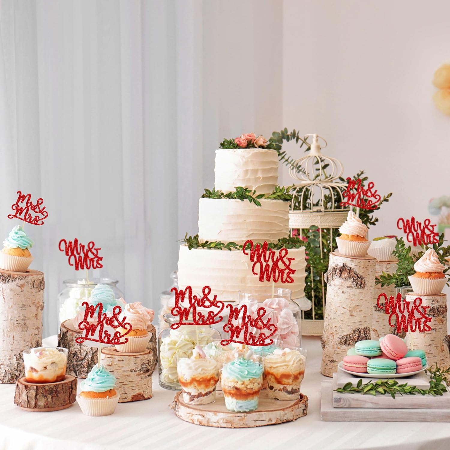 Gyufise 36Pcs Mr & Mrs Cupcake Toppers Glitter Bridal Shower Cupcake Picks for Wedding Engagement Birthday Anniversary Party Cake Decorations Supplies Red