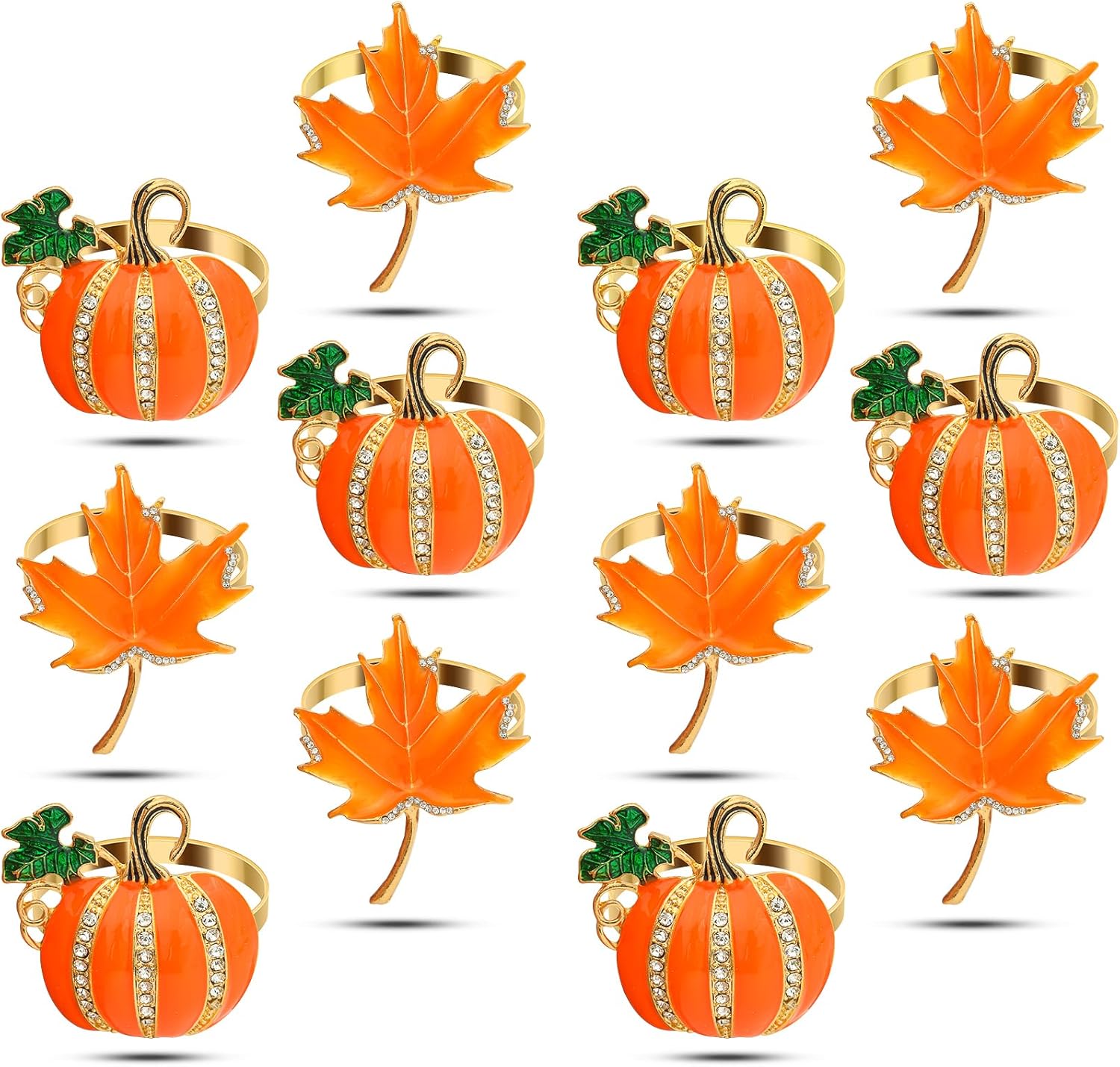 KPOSIYA Fall Napkins Rings, 12 Pcs Thanksgiving Napkin Ring Fall Maple Leaf Napkin Rings and Halloween Pumpkin Napkin Holders for Thanksgiving Table Decorations, Fall Banquet, Holiday Dinner Party