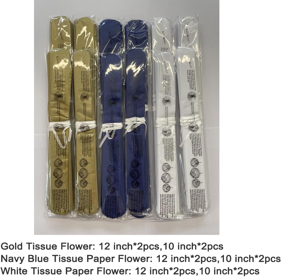 • Tissue Paper Flower Royal Blue and Gold 12pc in 2 sizes,package include gold crafts flower 4pc (2pc in 12'' and 2pc in 10''), royal blue crafts flower 4pc(2pc in 12'' and 2pc in 10''), white crafts flower 4pc(2pc in 12'' and 2pc in 10'')