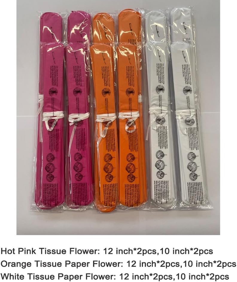 • Tissue Paper Flower Hot Pink and Orange 12pc in 2 sizes,package include hot pink crafts flower 4pc (2pc in 12'' and 2pc in 10''), orange crafts flower 4pc(2pc in 12'' and 2pc in 10''), white crafts flower 4pc(2pc in 12'' and 2pc in 10'')