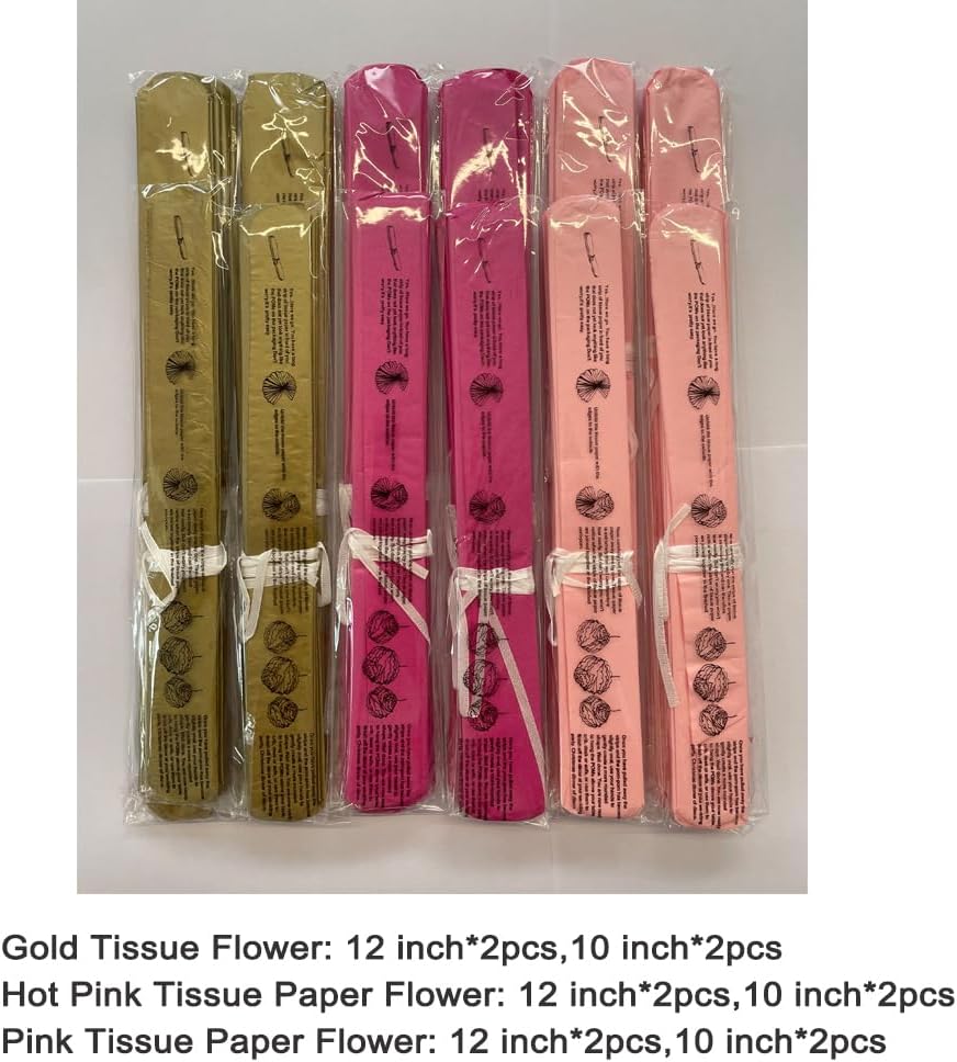 • Tissue Paper Flower Gold Hot Pink and Pink 12pc in 2 sizes,package include gold crafts flower 4pc (2pc in 12'' and 2pc in 10''), hot pink crafts flower 4pc(2pc in 12'' and 2pc in 10''), pink crafts flower 4pc(2pc in 12'' and 2pc in 10'')