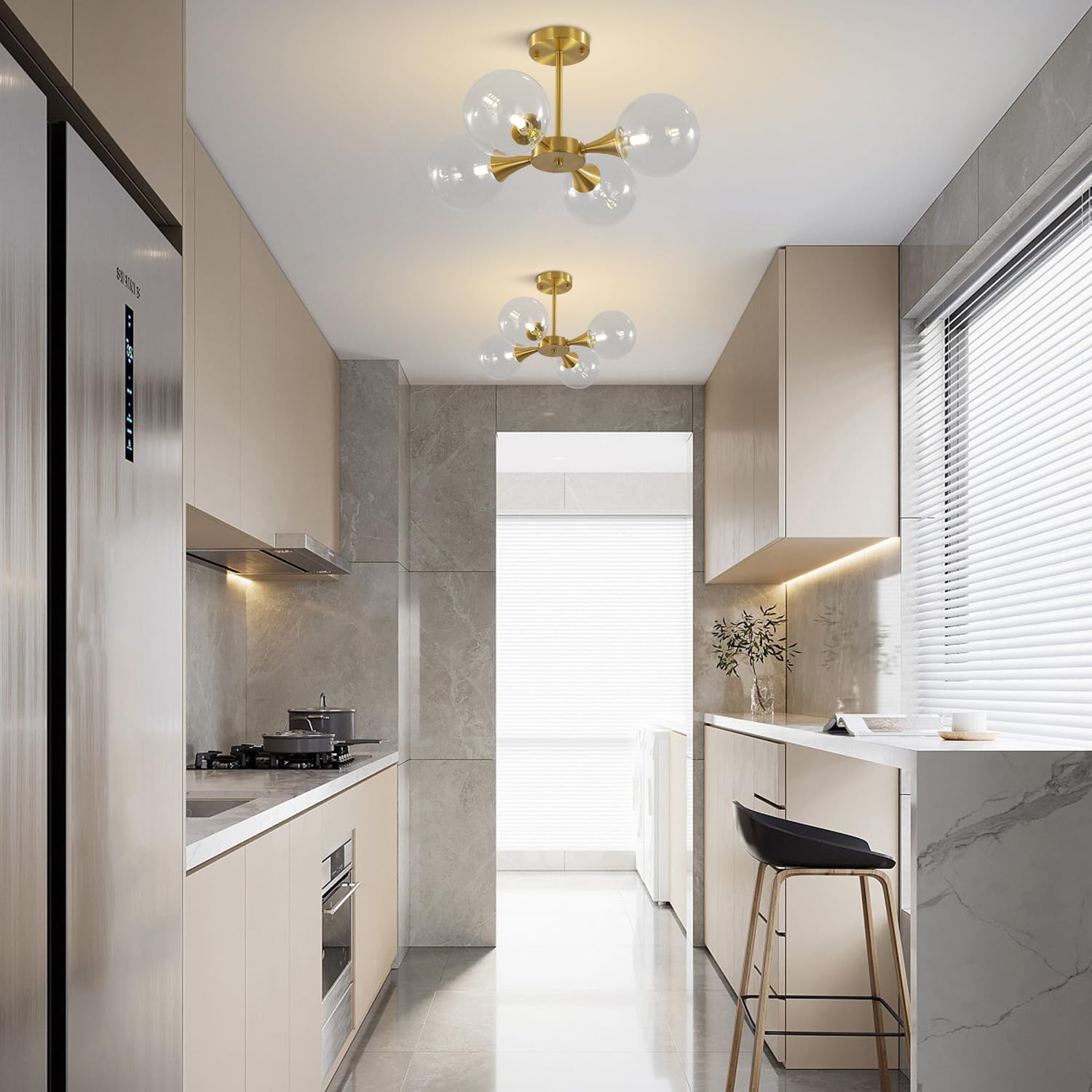 • Modern Gold Semi Flush Mount Ceiling Light: The clear flush mount clear light consists of 4 brushed brass metal branches, each with clear glass lampshade, provide comfortable and sufficient lighting in the room where it is placed. The brass gold hall ceiling light will creating mid-century modern style and simple look in your interior room