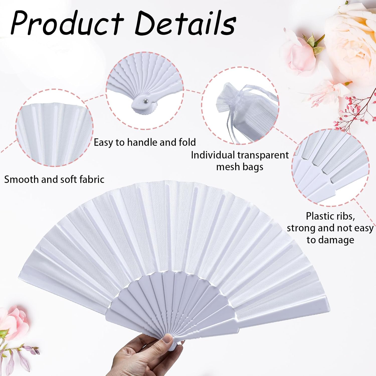 • Easy to Carry: these white handheld fans are equipped with a corresponding storage bag, which is convenient for folding fan storage; And these wedding folding fans are small, light and portable, very suitable for putting in the bag when going out, bringing a cool feeling in hot weather, very practical
