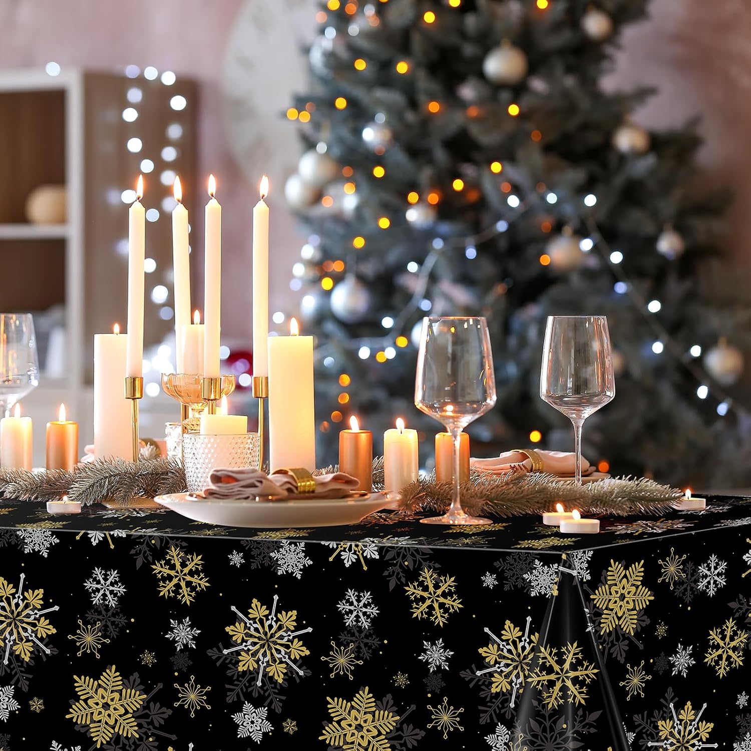 • What will you receive: 6 pieces black and gold Christmas plastic party tablecloth,all over printed with gold and white snowflake patterns on black backdrop,ideal for decorating your winter holiday and Christmas party supplies and decorations