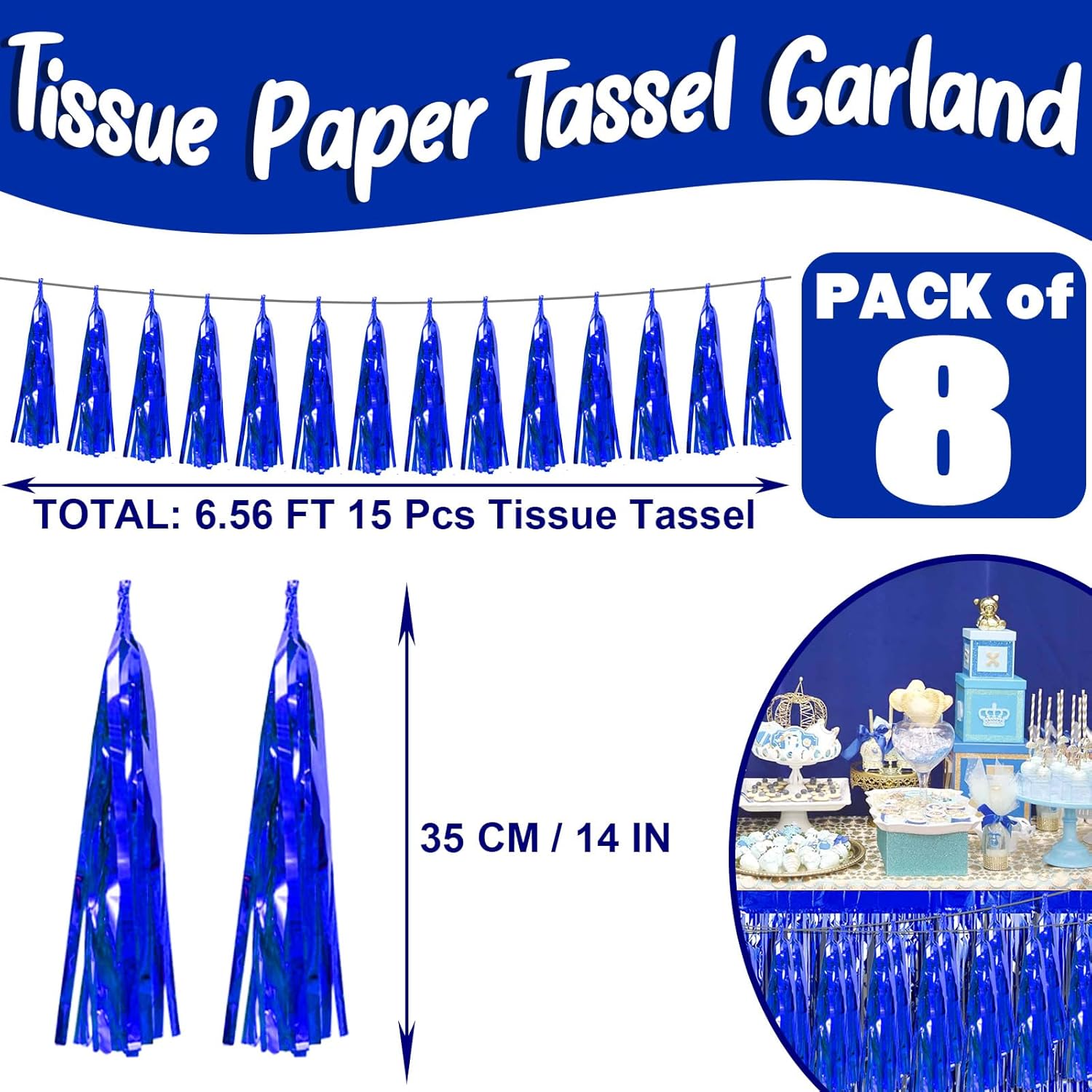 8P Blue Foil Fringe Metallic Tassel Streamers Banner Tassel Garland for Parade Floats, Bachelorette, Wedding, Birthday, Halloween, Christmas, Bridal/Baby Shower Party Decorations