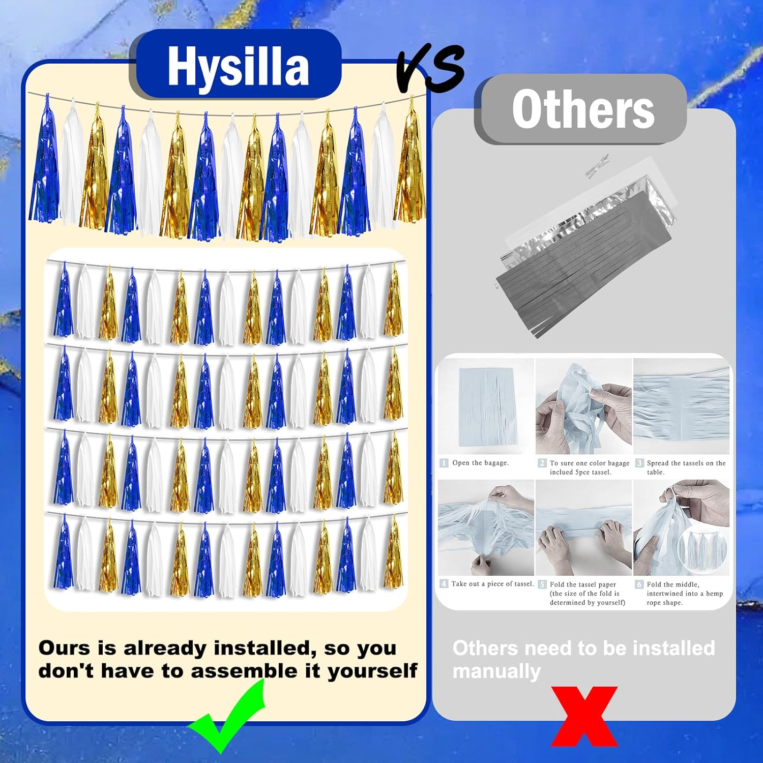 • 【Navy Blue White Gold Party Supplies Set】: The total length of the navy blue white gold birthday tassels banner is 29.5 feet 45tassels, divided into 3 strips, each 9.8 feet long. Each banner contains 15 tassels, and each tassel measures 14 inches, for birthday decorations many occasions, and so on