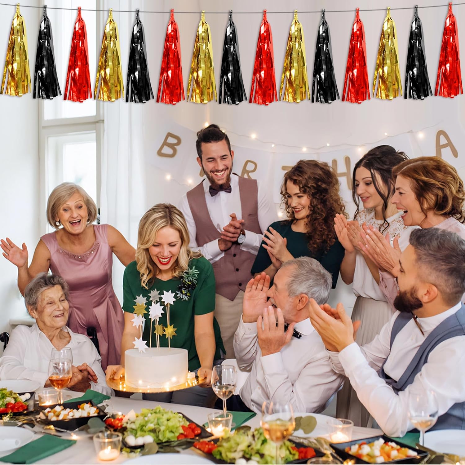 • 【Black Red Gold Party Supplies Set】: The total length of the black red gold birthday tassels banner is 29.5 feet 45tassels, divided into 3 strips, each 9.8 feet long. Each banner contains 15 tassels, and each tassel measures 14 inches, for birthday decorations many occasions, and so on