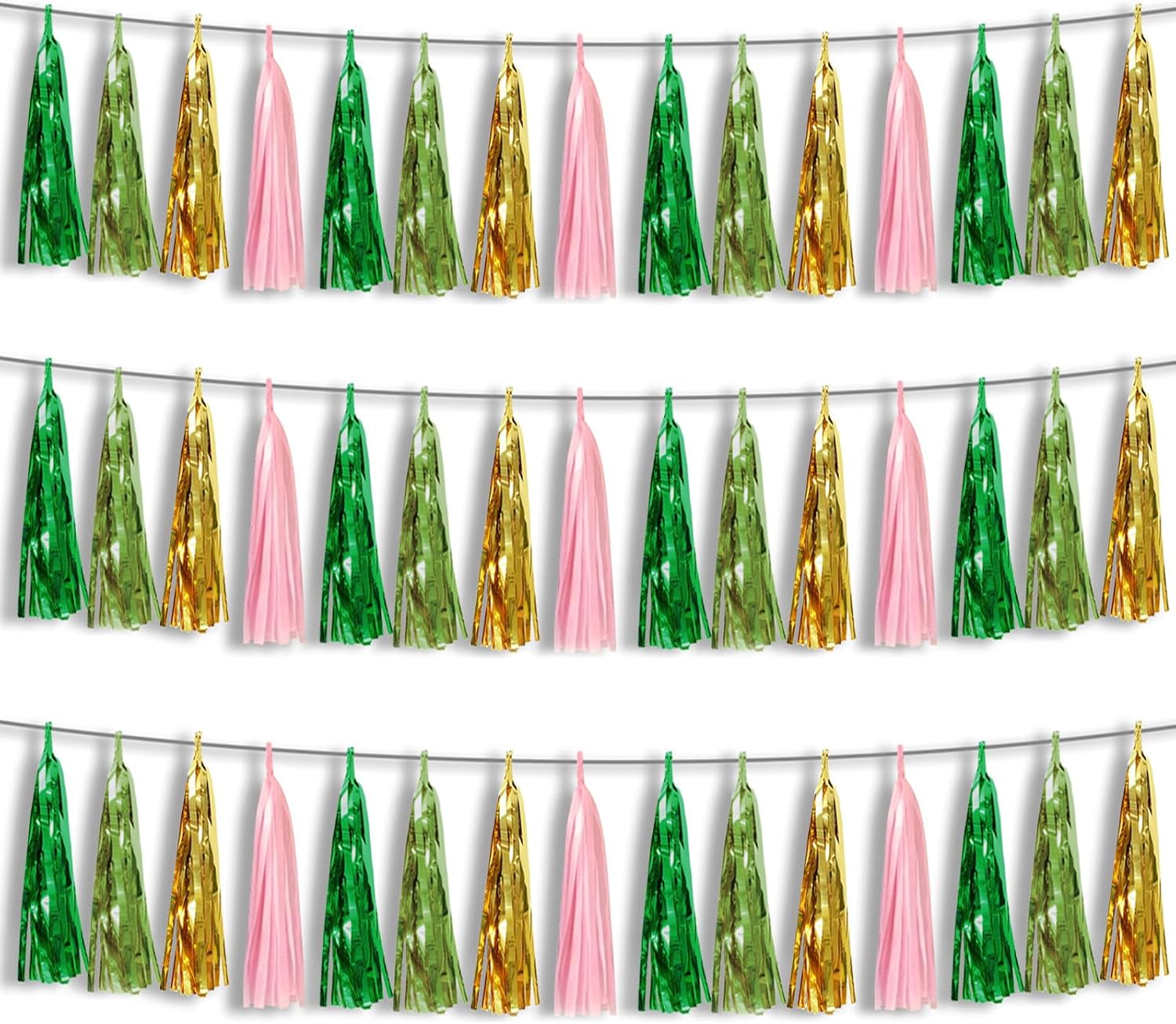 3P Sage-Green Pink-Gold Foil Fringe Metallic Tassel Garland, Tassels Banner Streamers for Parade Floats, Bachelorette, Wedding, Birthday, Halloween, Christmas, Bridal/Baby Shower Party Decorations