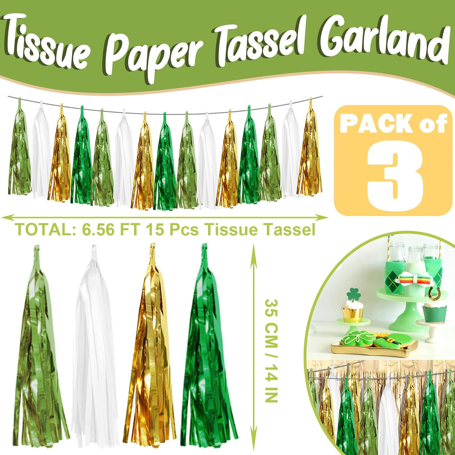 • 【Light Green White Gold Green Party Supplies Set】: The total length of the Light Green White Gold Green birthday tassels banner is 29.5 feet 45tassels, divided into 3 strips, each 9.8 feet long. Each banner contains 15 tassels, and each tassel measures 14 inches, for birthday decorations many occasions, and so on