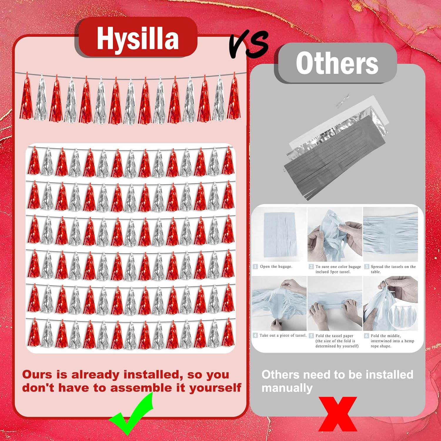 • 【Perfect Party Decoration】The Red Silver tinsel garlands are designed in a metallic Fringe, bright, and beautiful, at the same time, they shine in the sun, and these gorgeous tassel garlands create a wonderful backdrop or centerpiece for your party space. and bring you, your family, and your friend's good Visual effects. your party many emotional and touching moments where a lot of pictures will be taken and everybody will have a wonderful time together.