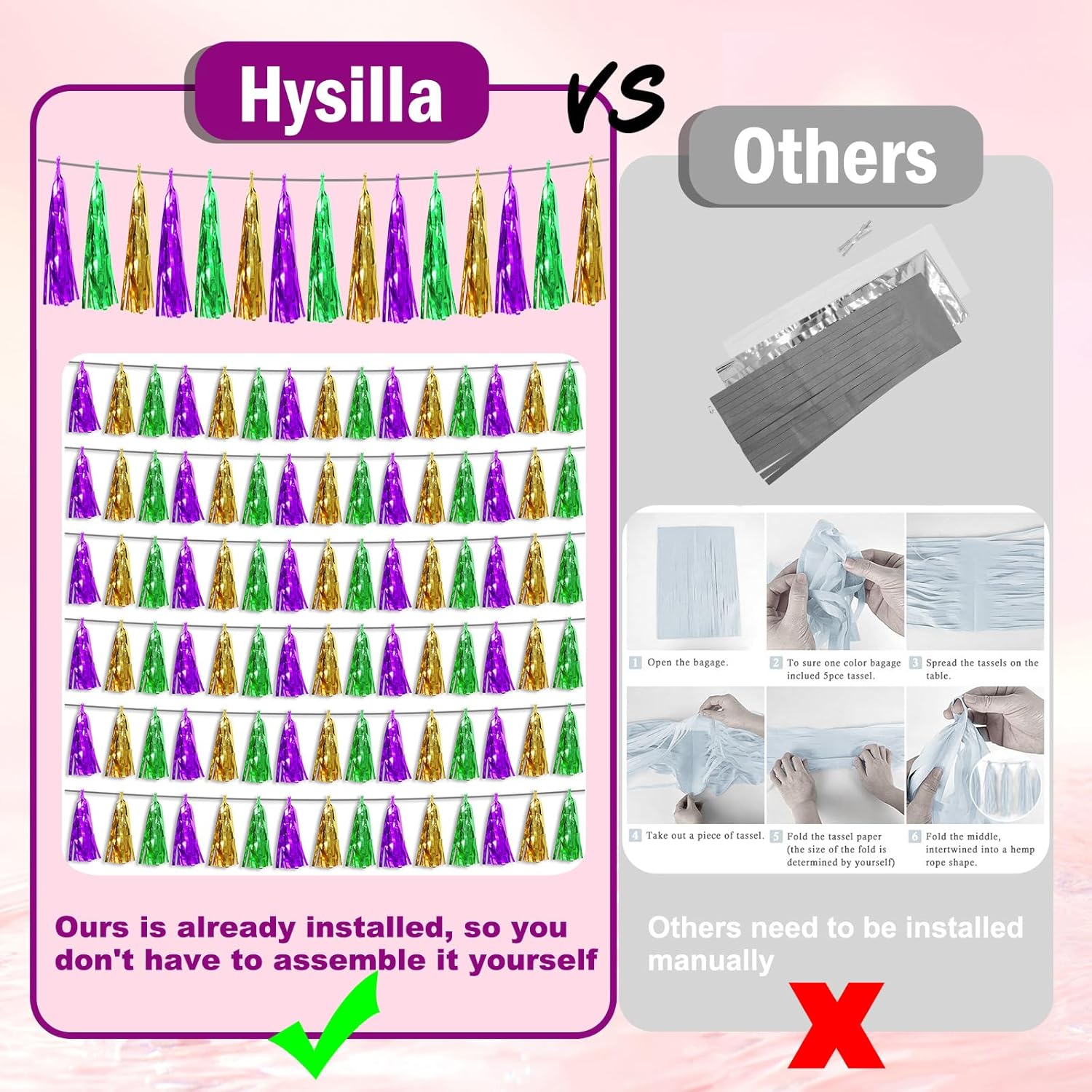 3P Purple Green Gold Foil Fringe Metallic Tassel Streamers Banner Tassel Garland for Parade Floats, Bachelorette, Wedding, Birthday, Halloween, Christmas, Bridal/Baby Shower Party Decorations