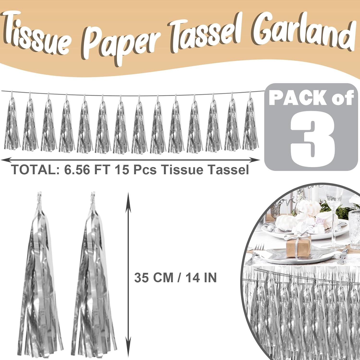 3P Silver Foil Fringe Metallic Tassel Streamers Banner Tassel Garland for Parade Floats, Bachelorette, Wedding, Birthday, Halloween, Christmas, Bridal/Baby Shower Party Decorations