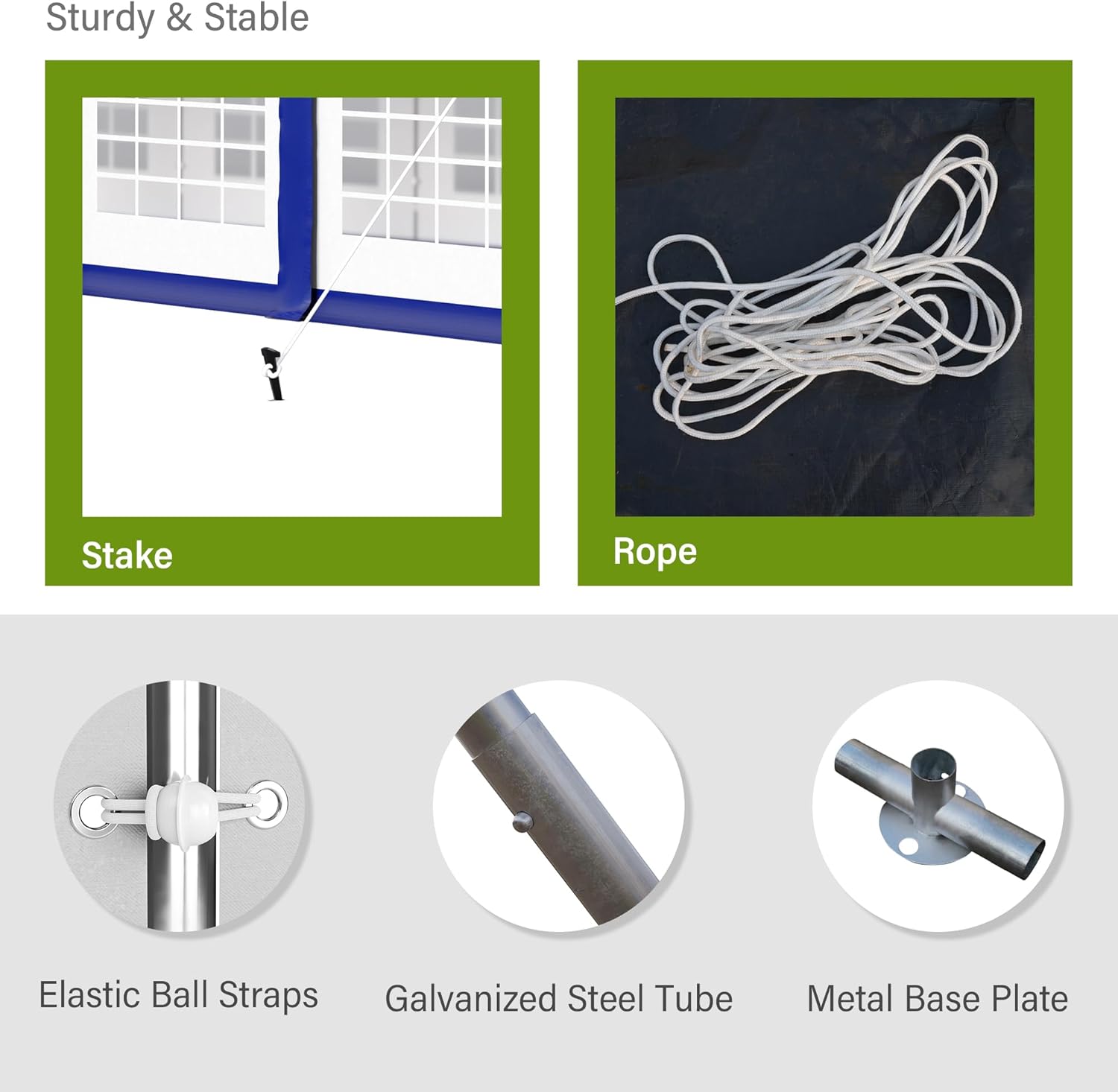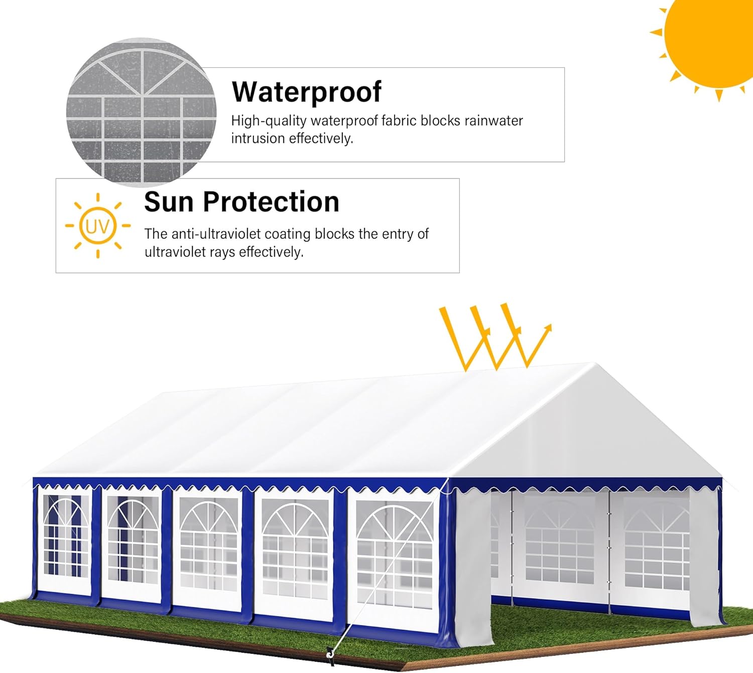 • Upgraded Galvanised Frame: The party tent is framed with heavy-duty thickened 38 mm upgraded galvanized steel tubing for durability. The surface is powder coated to prevent rust and corrosion