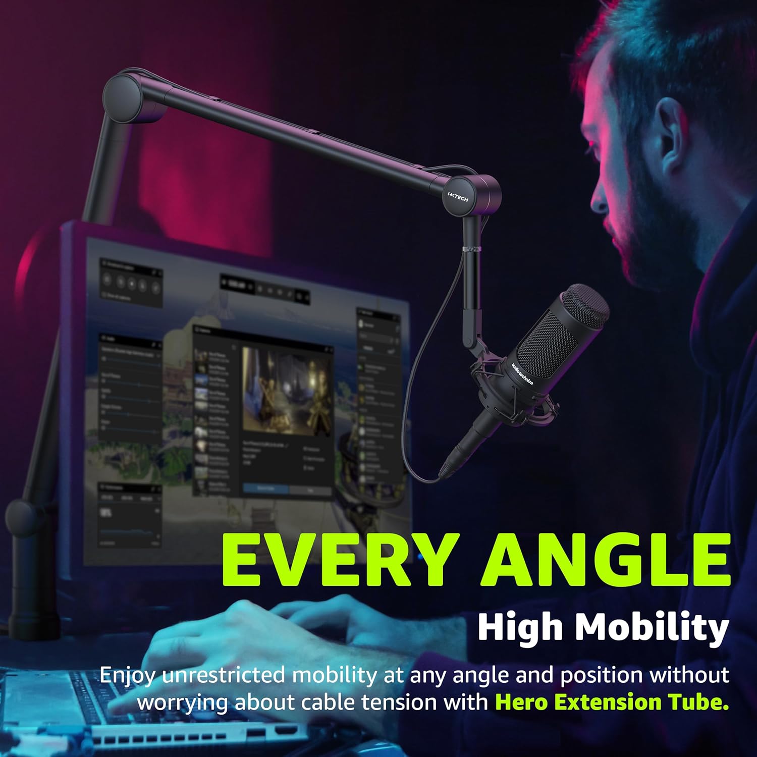 • Flexible Microphone Stand With Angle Adjustment: Make your voice sound better in the podcasting studio. This 360° rotatable microphone boom arm allows you to get the perfect mic placement much easier and with better posture.