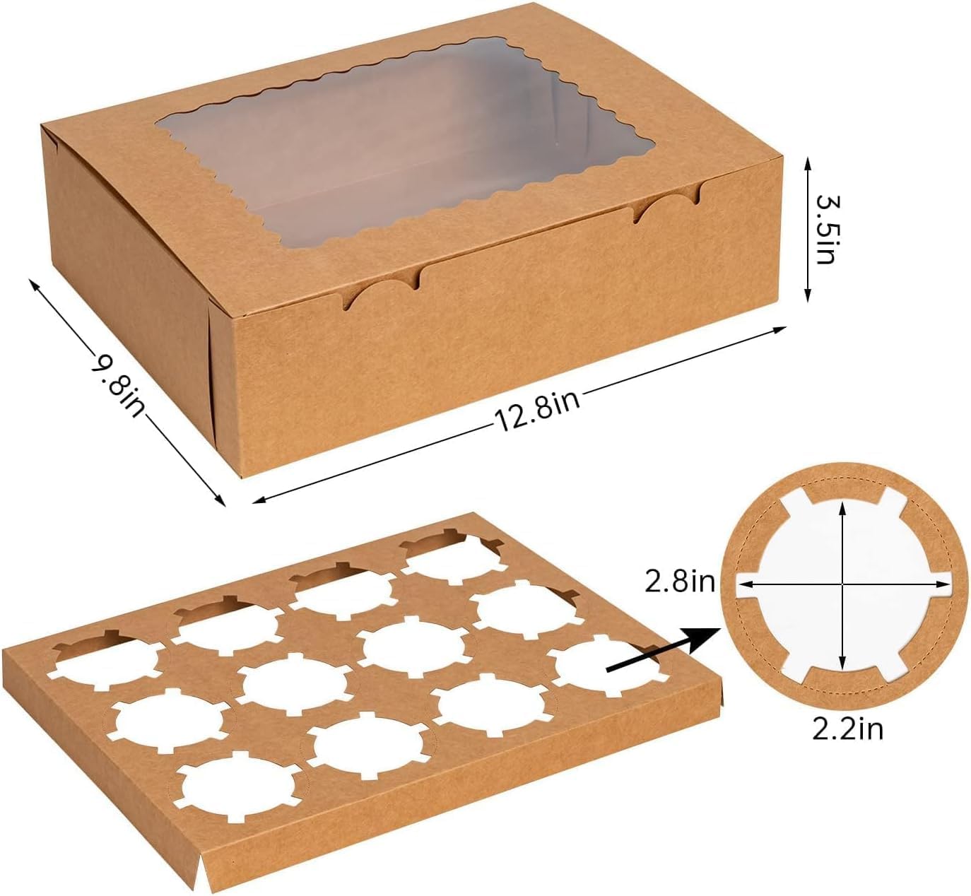 • Perfect Size: Our convenient boxes are generously sized that measures 12.8 x 10 x 3.5 inches, and insert measures 2.56" in diameter. Inserts are deep and wide enough to hold small or large cupcakes.