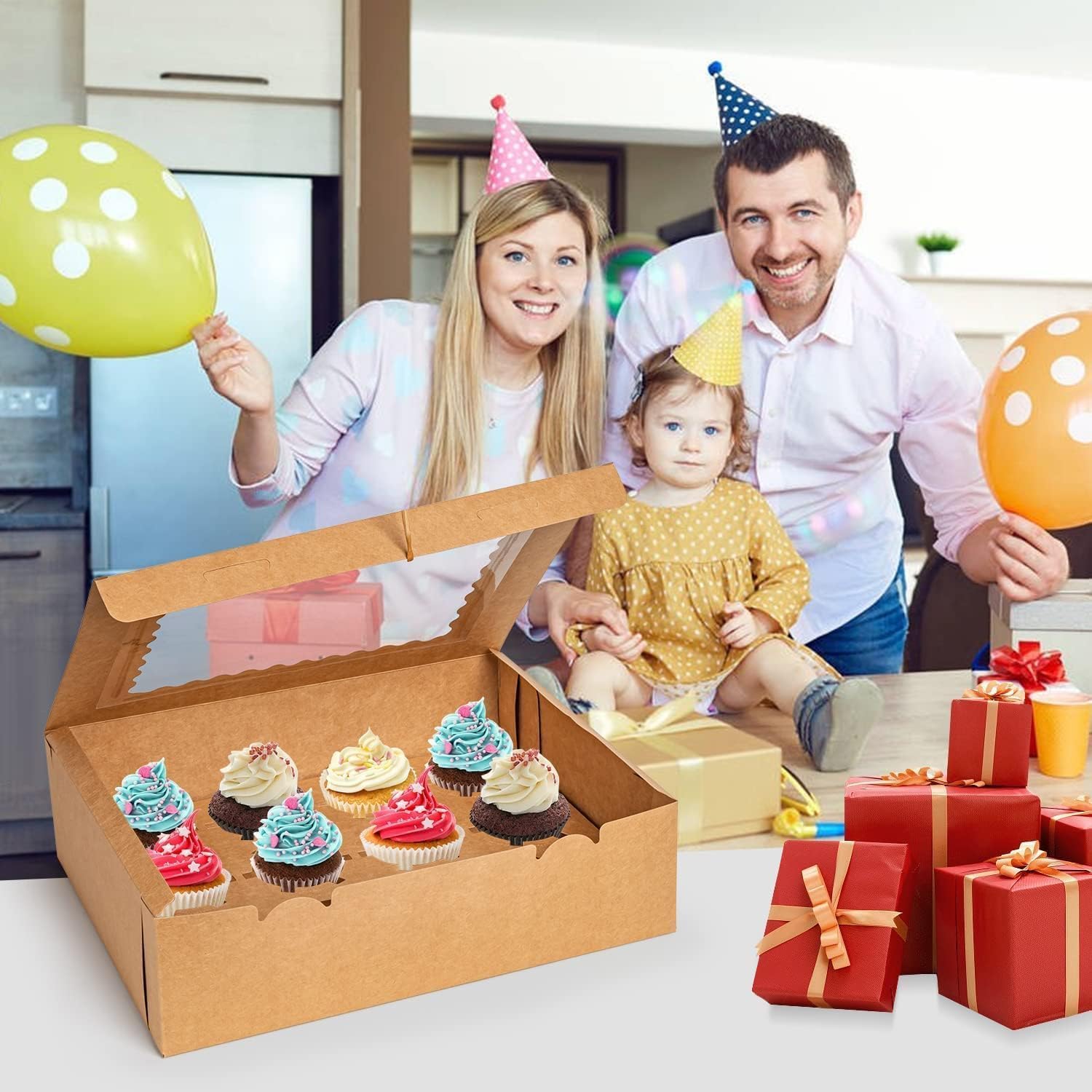 • Transparent Window: The cupcake box with a clear window at the top to display your delicious pastries and keep them fresh. The window is glued firmly, so don't worry about falling off.