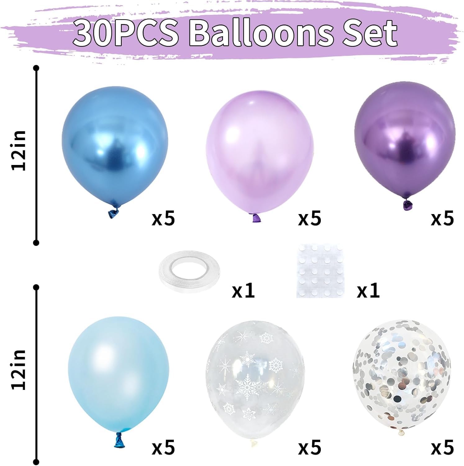 • Snow Balloon Sets: 5 x pearl blue balloons, 5 x pearl purple balloons, 5 x clear snowflake balloons, 5 x metallic blue balloons, 5 x metallic purple balloons, 5 x silver confetti balloons. That's a magnificent total of 30 pieces to unleash your creativity! Elevate your celebrations with our exquisite blue purple silver balloon sets!