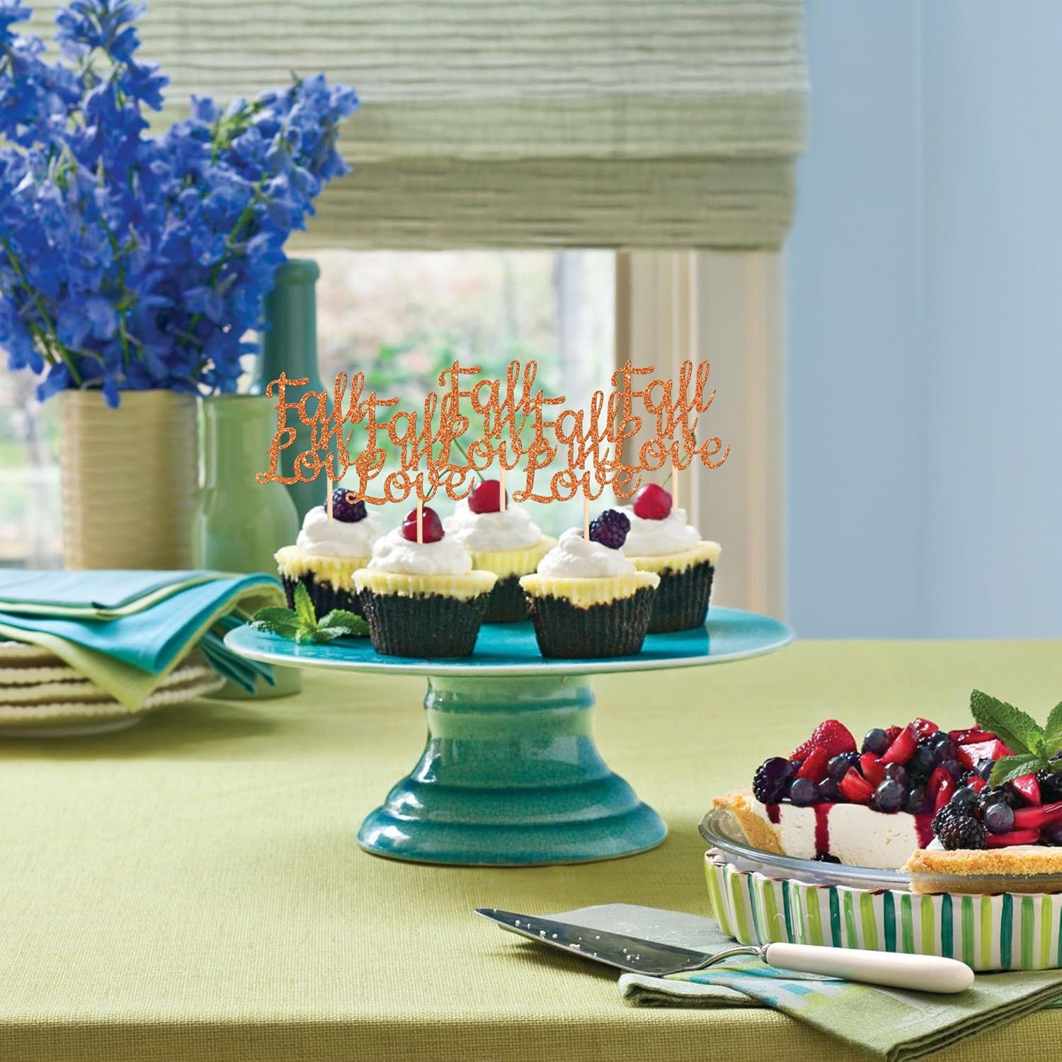 24 PCS Fall in Love Cupcake Toppers Glitter Fall Theme Bridal Shower Cupcake Picks for Autumn Wedding Engagement Anniversary Birthday Party Cake Decorations Supplies Orange