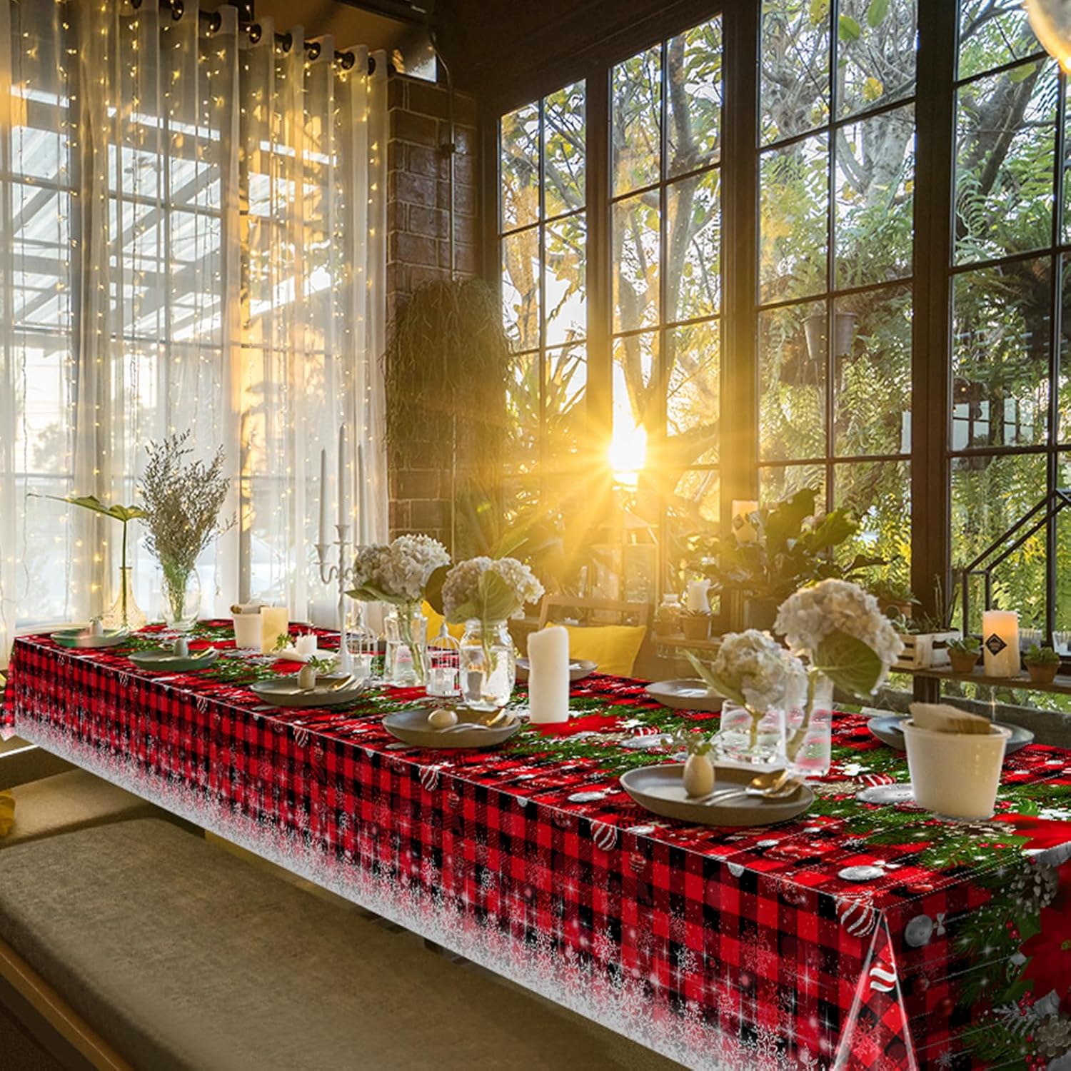 6Pcs Christmas Buffalo Plaid Snowflake Tablecloths,Plastic Red and Black Checkered Rectangle Christmas Tree Color Ball Table Cover for Winter Christmas New Year Holiday Party Decorations,54x108 inch