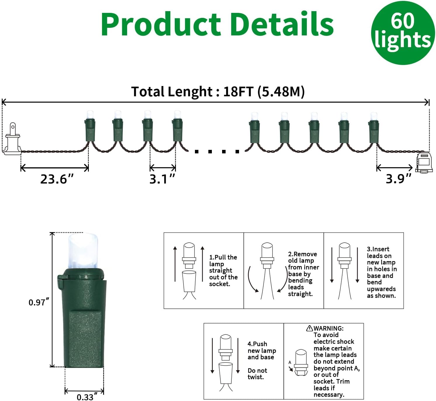 • 5mm LED Christmas Lights: 60 counts white 5mm wide angle stable LED string lights spaced 3.1 inches apart with green wire. 23.6 inch leads have a stackable male plug and 3.9 inch tails have a female plug for easy end to end connection.