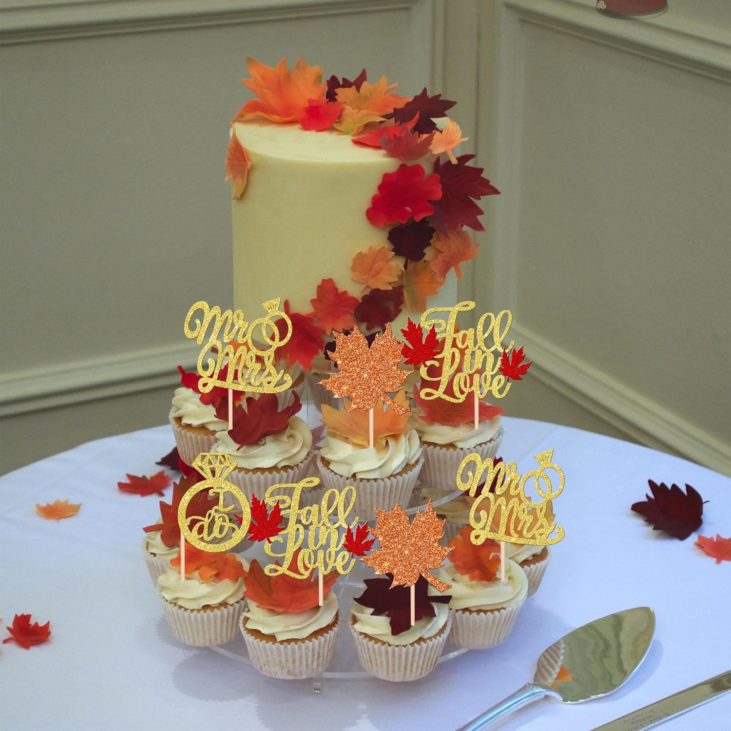 24 PCS Fall in Love Cupcake Toppers Glitter Maple Leaf Cupcake Picks Mr & Mrs Diamond I Do Cupcake Decorations for Autumn Wedding Engagement Bridal Shower Theme Party Cake Decorations Supplies