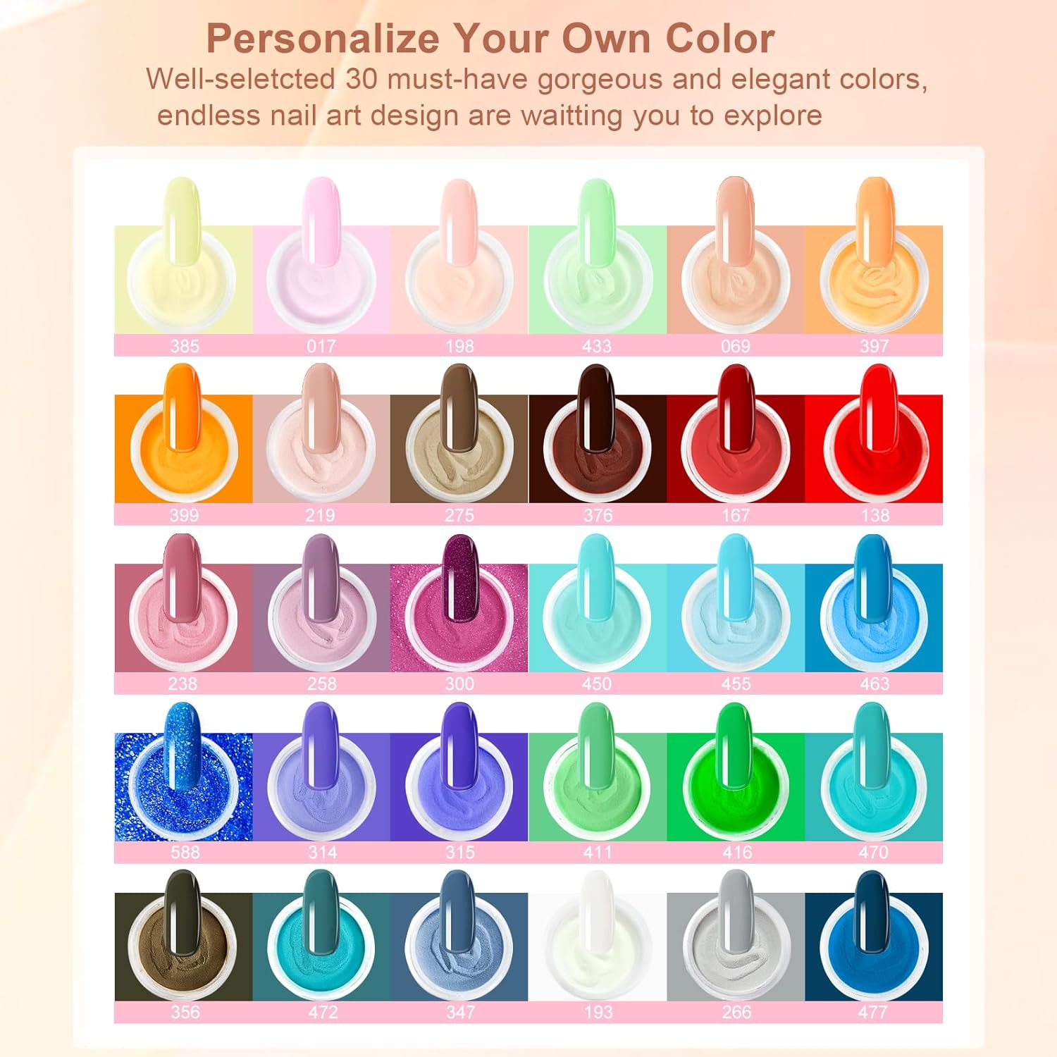 • Included Components : Dip Powder(30*0.35oz), Dip Liquid Set(4*0.5floz), Nail Brush*1, Nail file*1,Substitute brush*2, Nail Stick*2,Cuticle Pusher*1 Dip Powder(30*0.35oz), Dip Liquid Set(4*0.5floz), Nail Brush*1, Nail file*1,Substitute brush*2, Nail Stick*2,Cuticle Pusher*1
