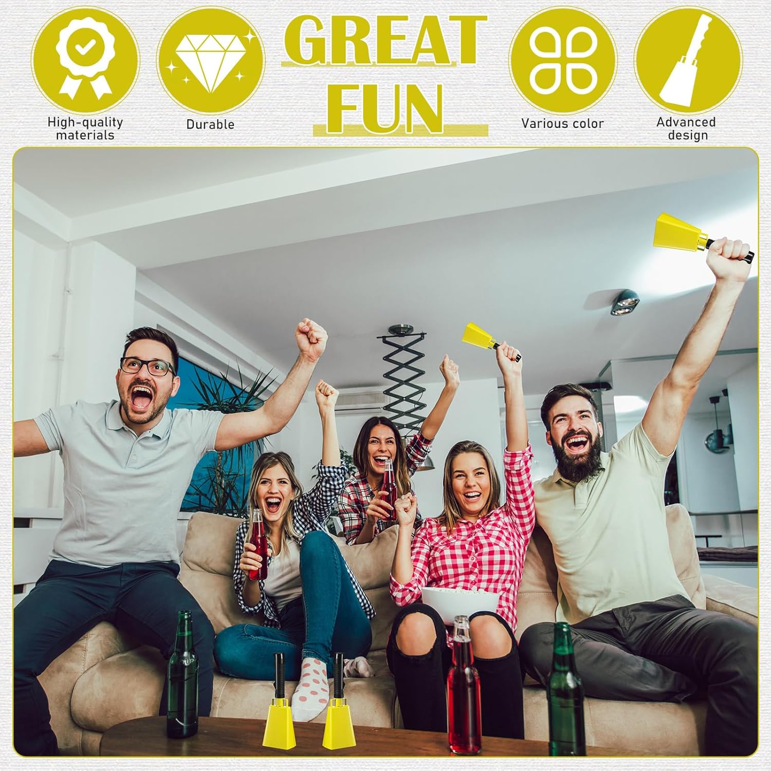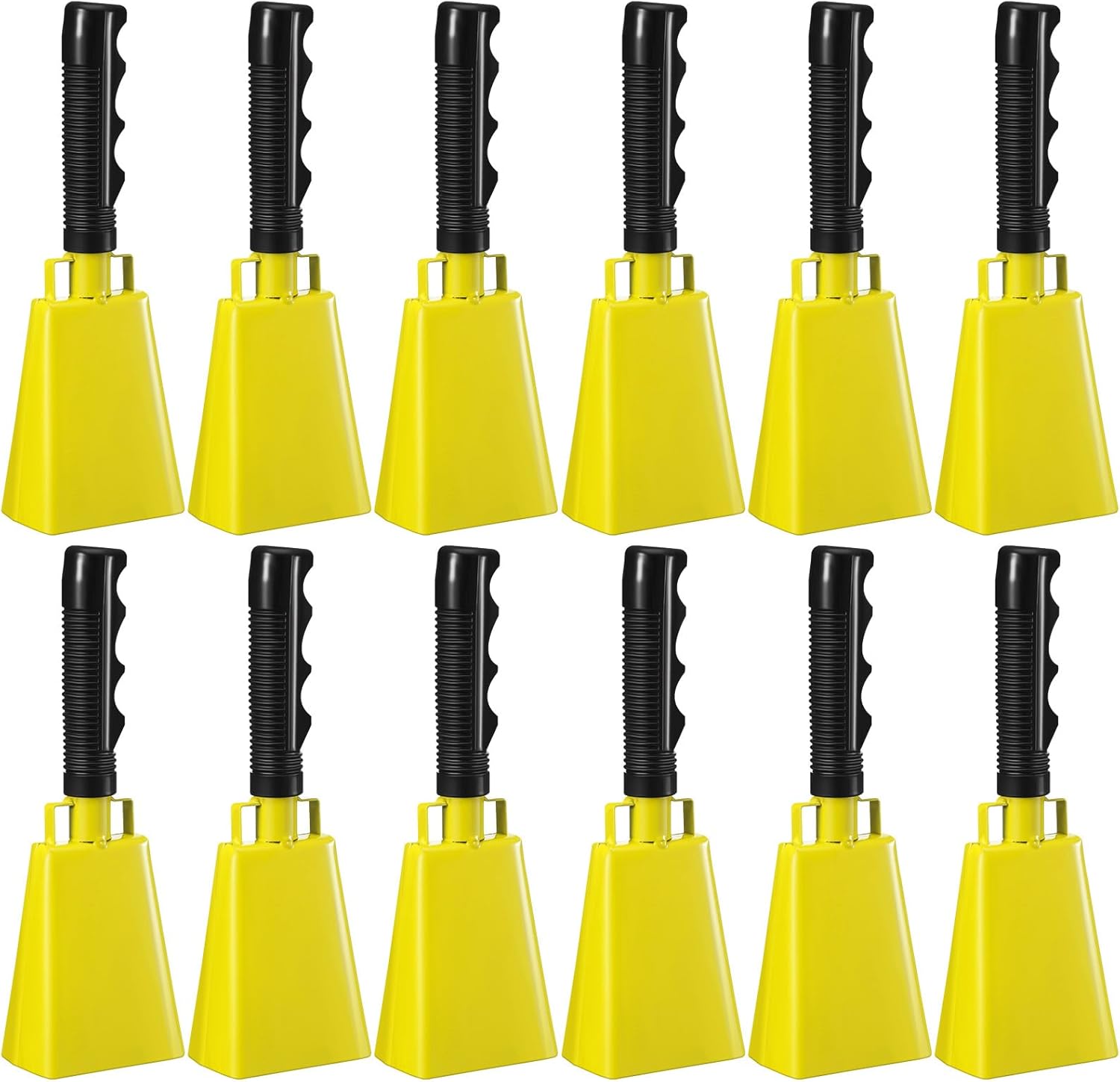 Pelopy 12 Pcs Large Cow Bell 9 '' Cowbell with Handle Cowbells for Sporting Events Hand Percussion Cheering Bell Chimes for Football Game, Alarm Loud Noise Makers, Musical Instrument(Yellow)