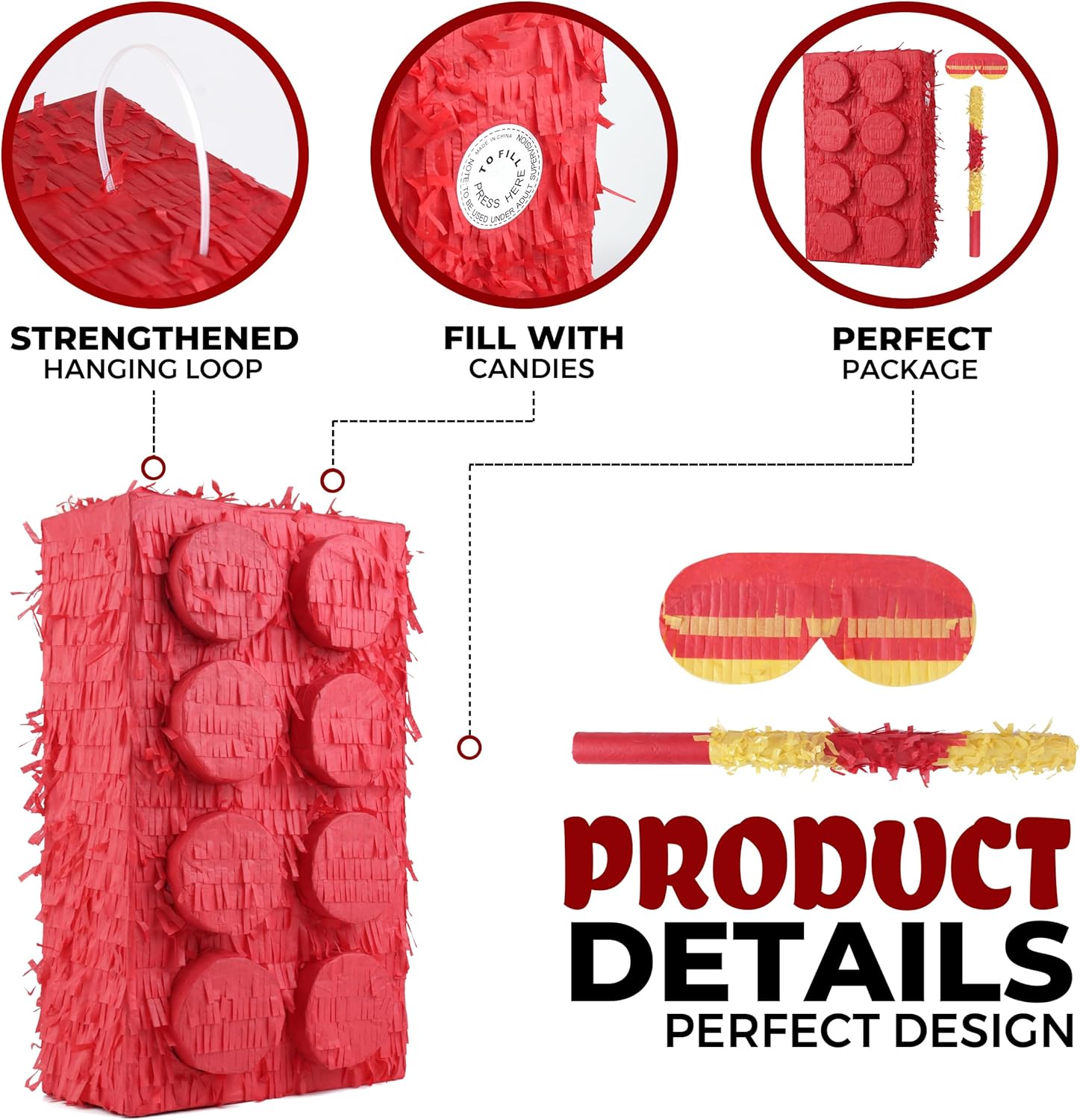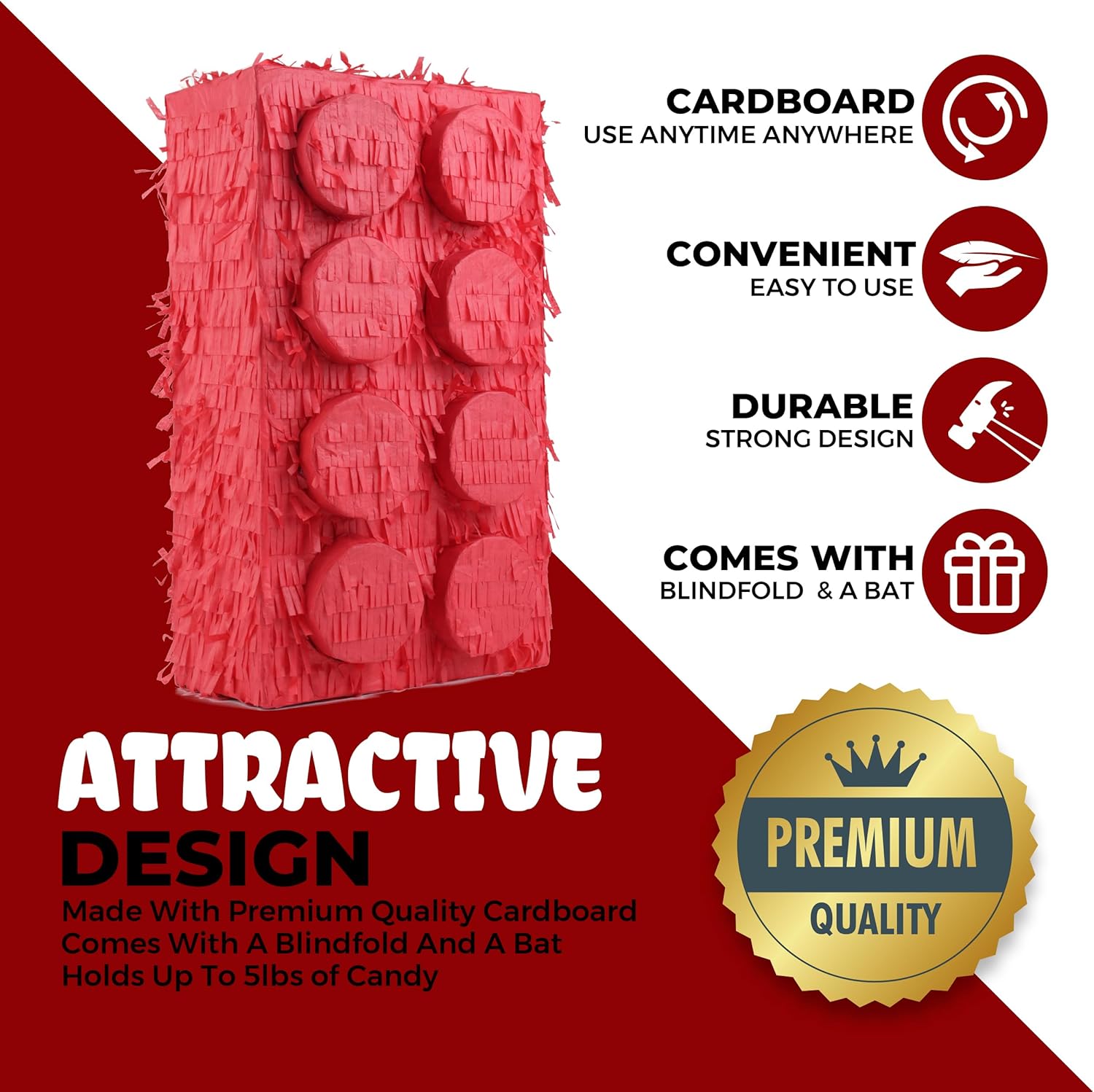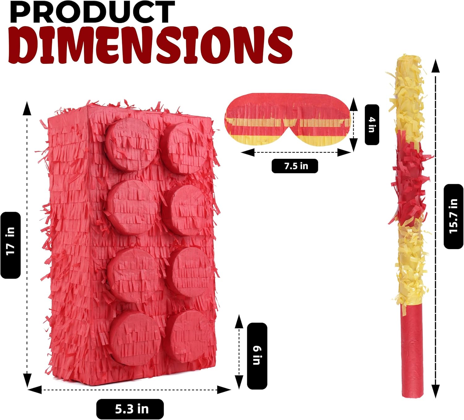 • ❤️【 PREMIUM QUALITY 】- The block pinata measures 17 x 11 x 4 inches. Made with high and resistant cardboard. Decorated with crepe paper on bond paper, high strength plastic loop to hang. Premium material ensures its durability and fancy looking. It comes with a blindfold and bat to make more fun.