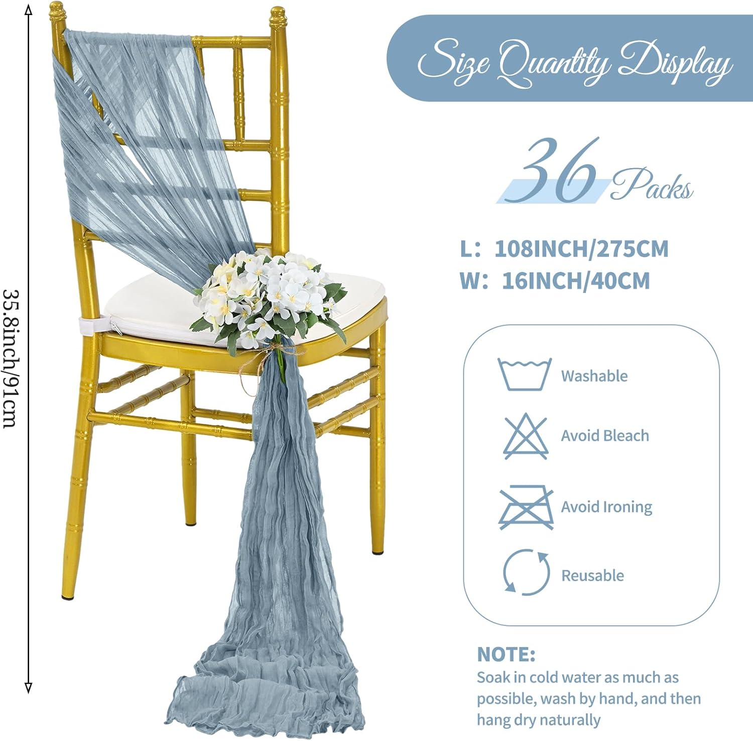 36 Pcs Dusty Blue Cheesecloth Chair Sashes, 16 x 108 inch Gauze Fabric Washable Chair Sashes Bows Designed for Aisle Decorations Universal Chair Cover Decor for Wedding Reception Party Banquet