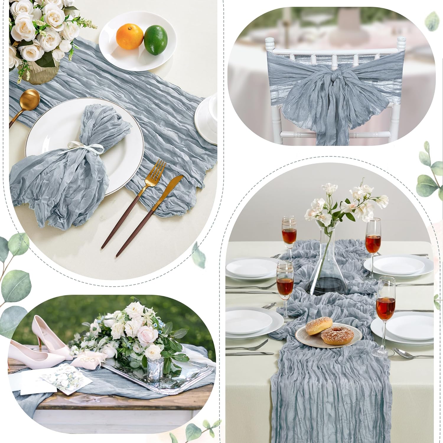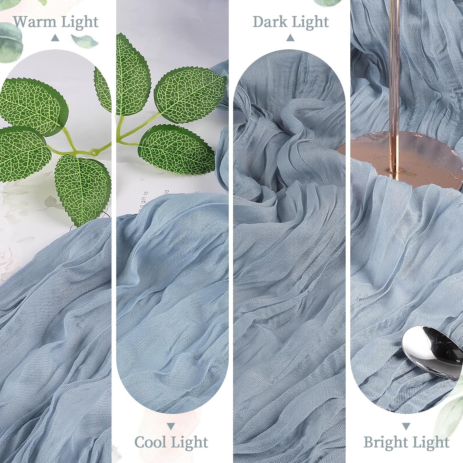 • PACKAGE INCLUDED: You will receive 12 pieces of dusty blue cheesecloth table runners. Elegant and beautiful design, exquisite workmanship. Product size: Each boho table runner is 35 x 120 inches. Enough to cover rectangles and round tables, as well as long tables that are stitched together. It can even be used to belt chairs decorate napkins, background curtains. Round or square tables for 8-10 people, perfect for romantic and elegant party events