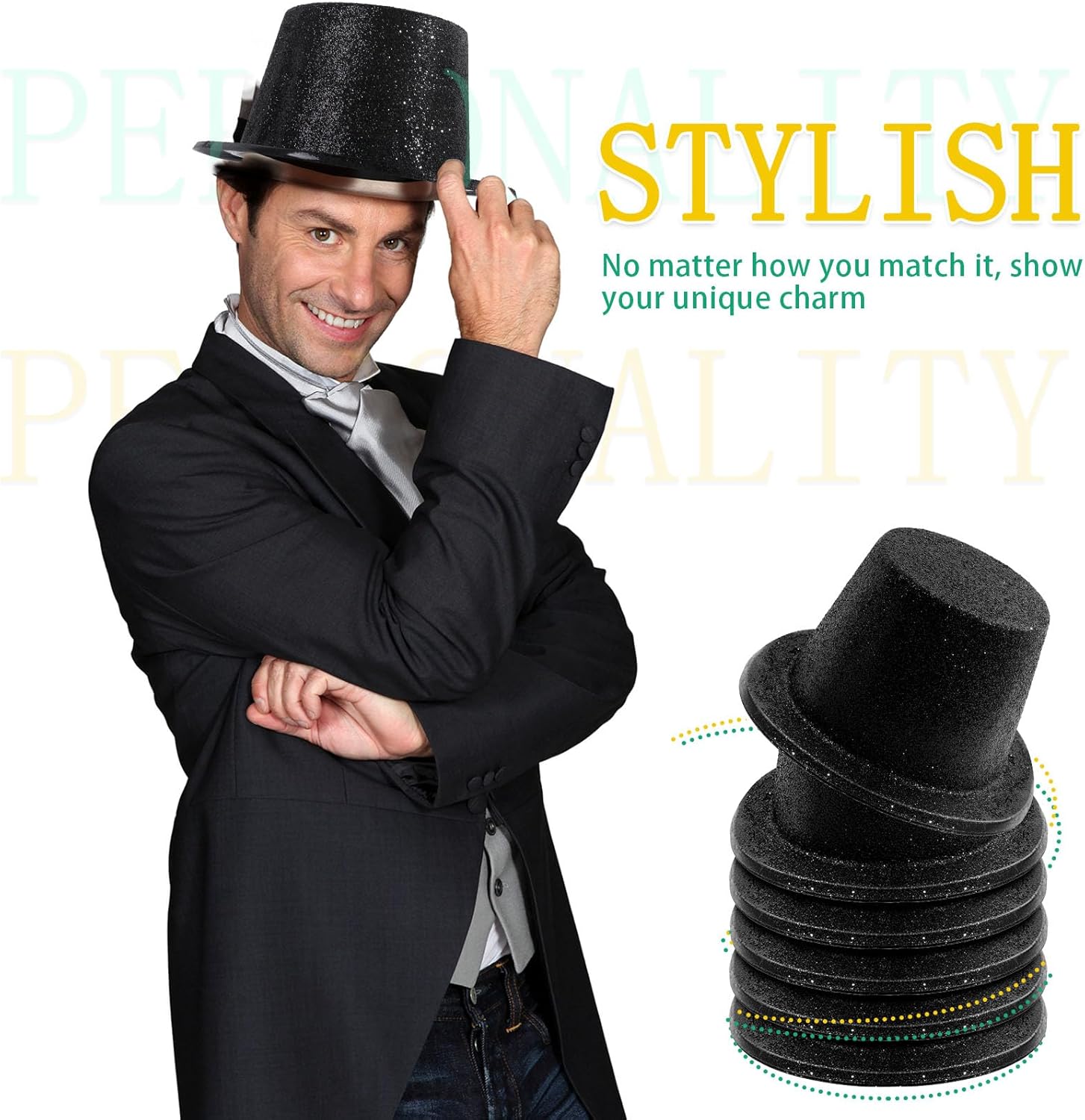 • Sophisticated Glitter Style: these Halloween top hat costume are designed with a dazzling glitter finish that complements any outfit; Whether teamed with tops, skirts, suits, etc., they add a charming touch to your ensemble, ideal for 1920s parties, Halloween party, wedding parties, stage shows and more