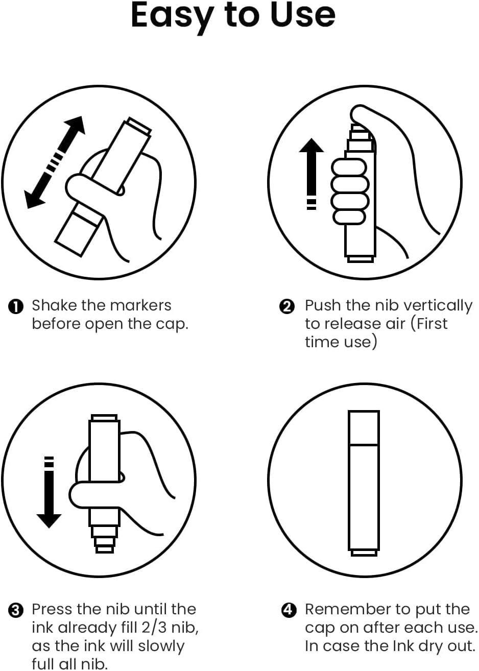 • Instruction: For the acrylic paint markers please shake the marker before use, and press the nib up and down or several times until jumbo marker tip fills with ink(first time use). Please cover the cap after use, in case the Ink dries out.