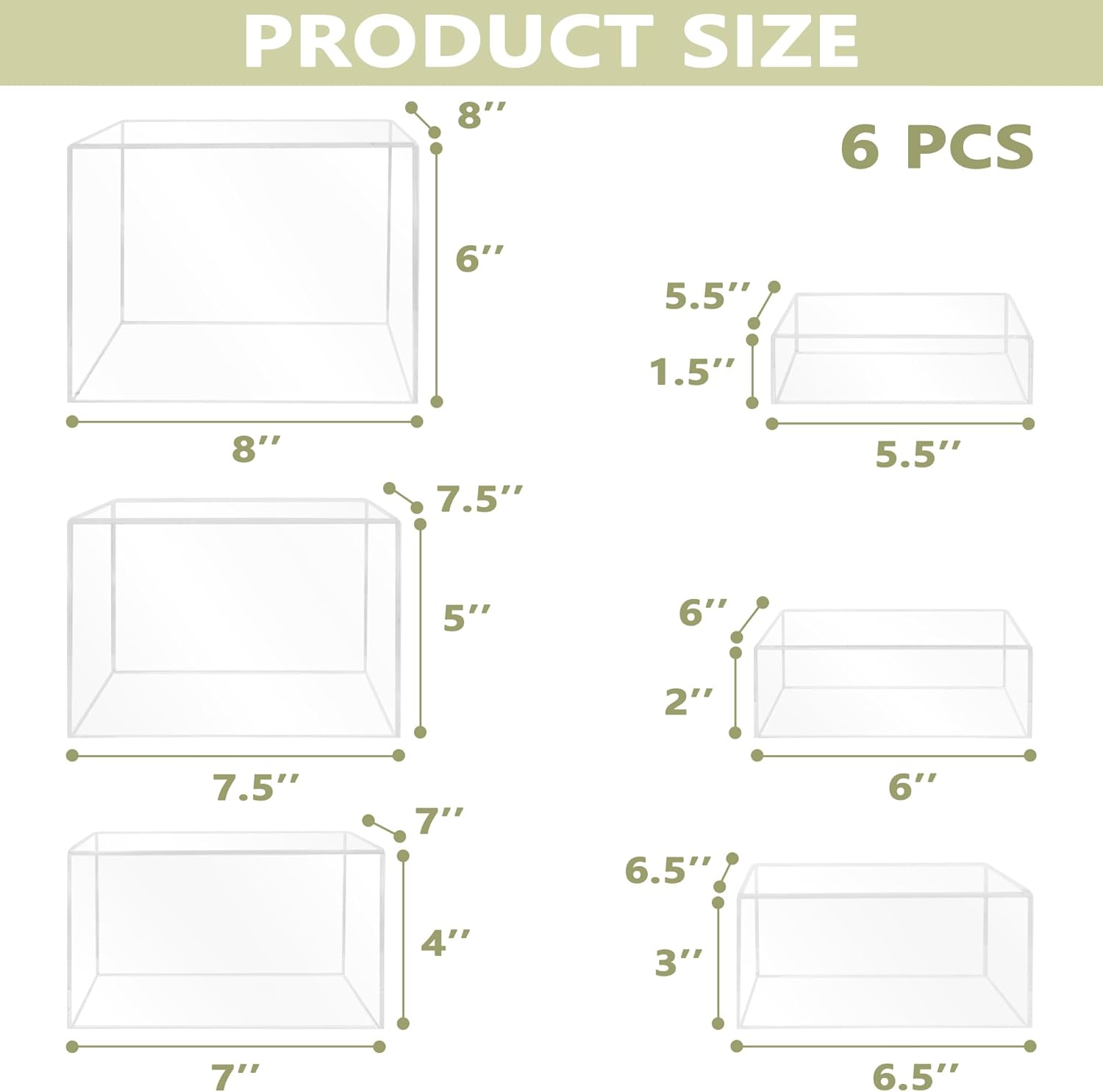• 6 Various Sizes: Please check measurements in pic3 before purchasing. Our array of acrylic display boxes offers versatility and practicality, available in six distinct sizes:5.5",6",6.5",7",7.5",8". these boxes are designed for nesting and stacking, providing a convenient solution for organizing and showcasing a variety of items.(Please carefully check detail sizes in pictures 3 before you purchase)