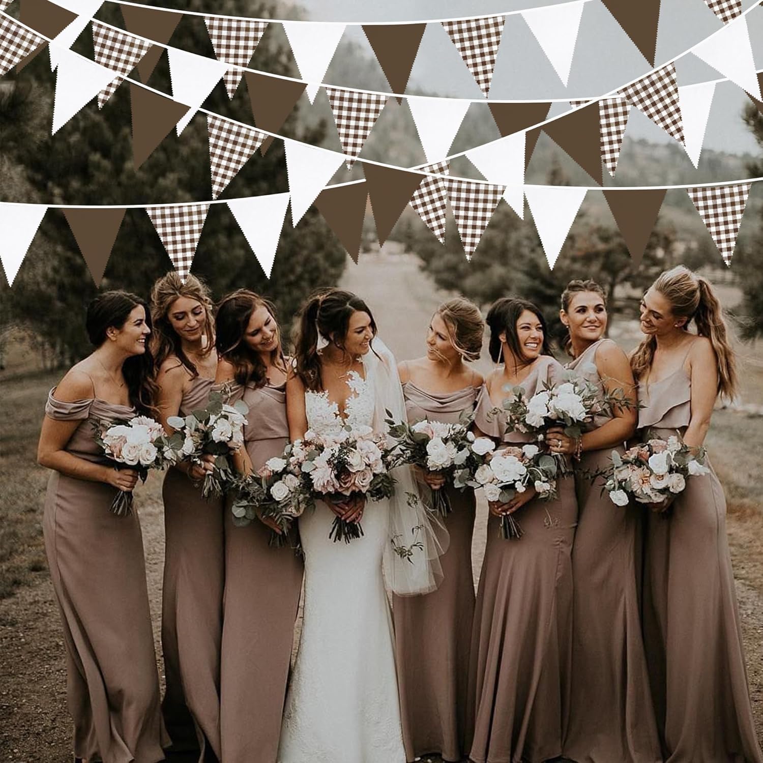 32Ft Coffee Brown Party Decorations Brown Buffalo Plaid Checkered White Triangle Flag Gingham Pennant Bunting Fabric Garland for Woodland Teddy Bear Baby Shower Birthday Home Outdoor Garden Decor
