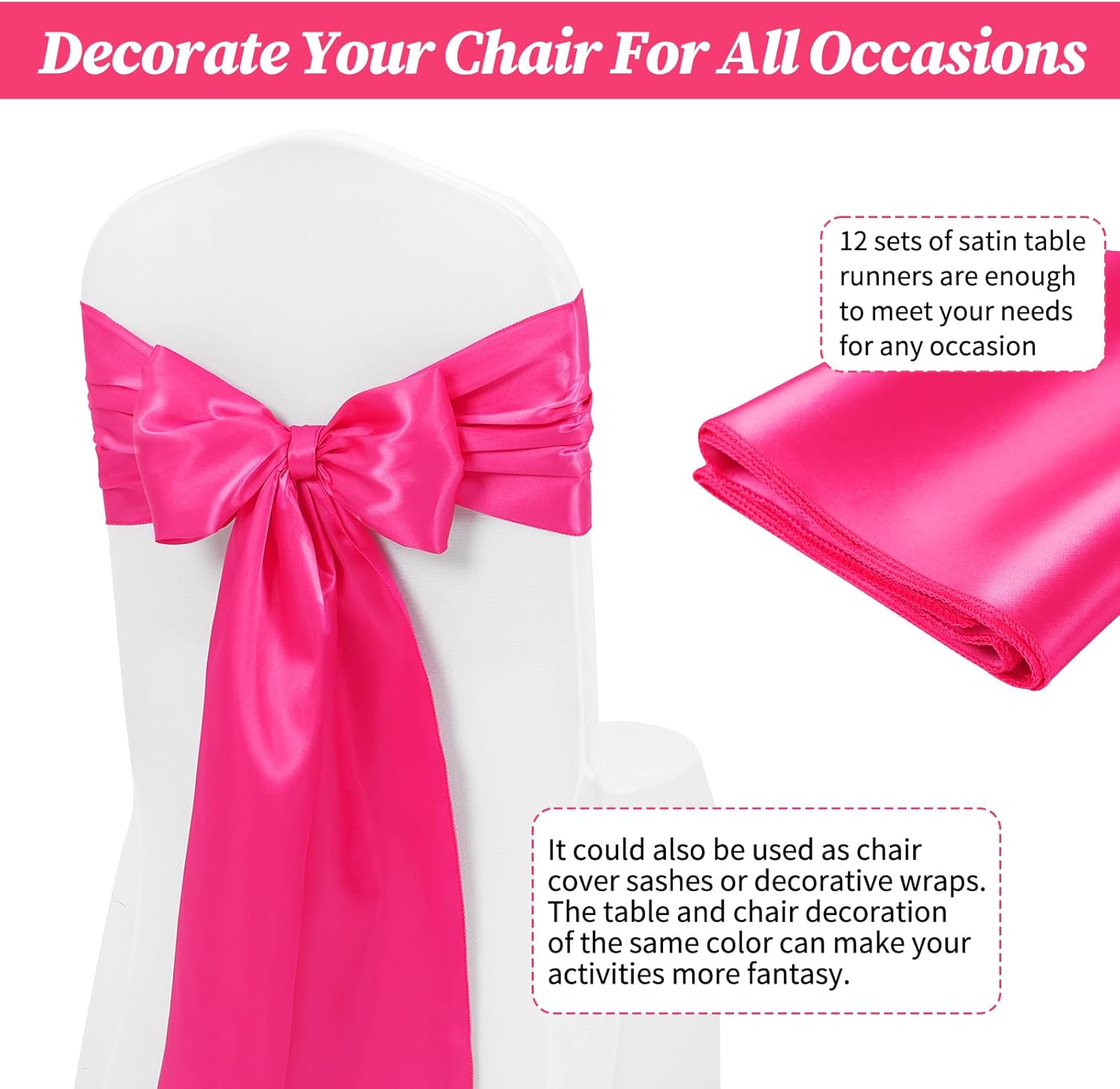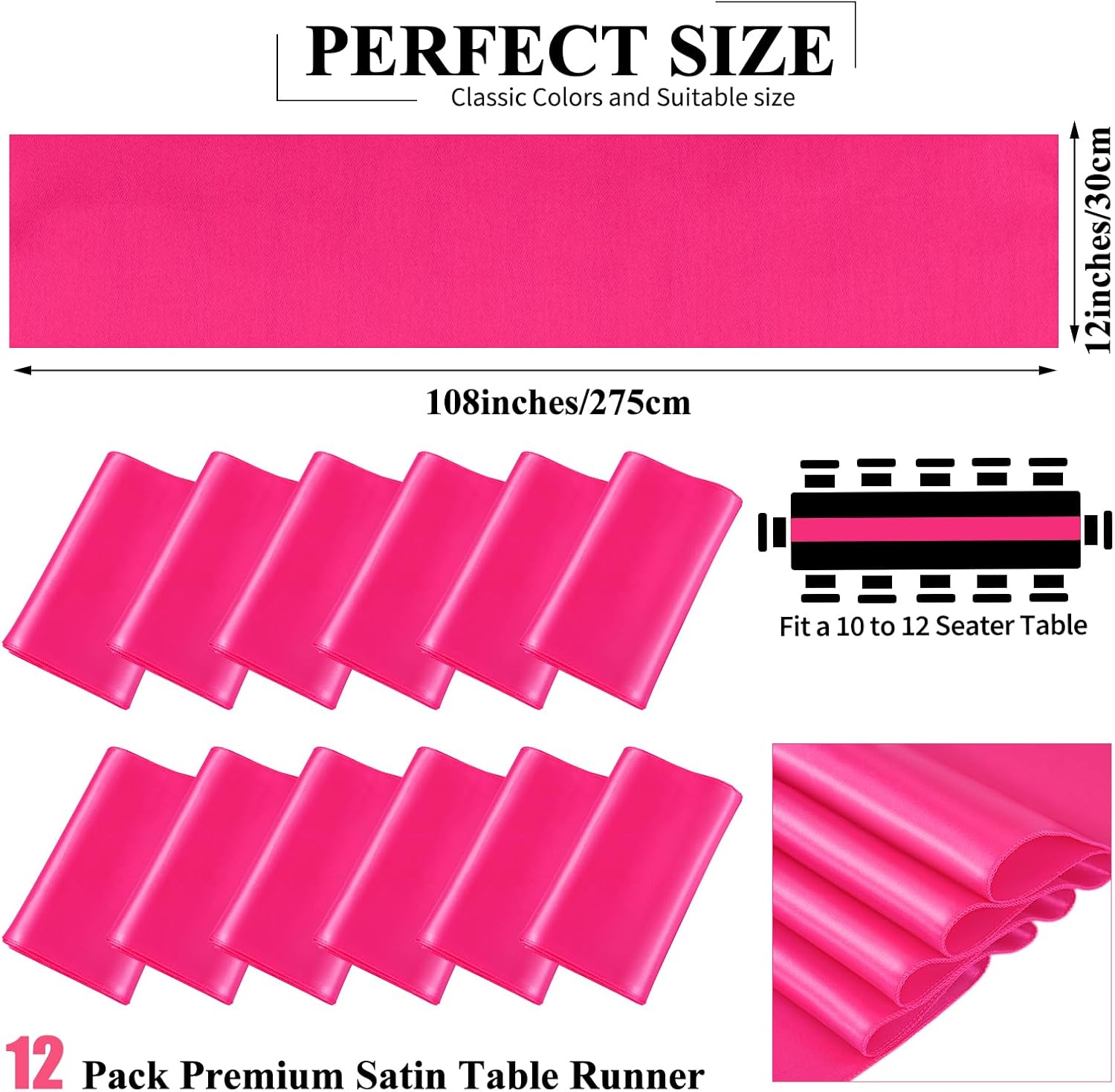 • 🍷【Set includes】12 Pack hot pink satin table runner measures 12" x 108" in size, appropriate for a table that can seat 8-10 people. This satin table runner can fit a 6ft/8ft rectangular table or round table well.This satin table runner is great for event table decorations.Our satin table runner make your dining table more dazzling and outstanding. Purchase ur 12piece satin table runner and save even more.