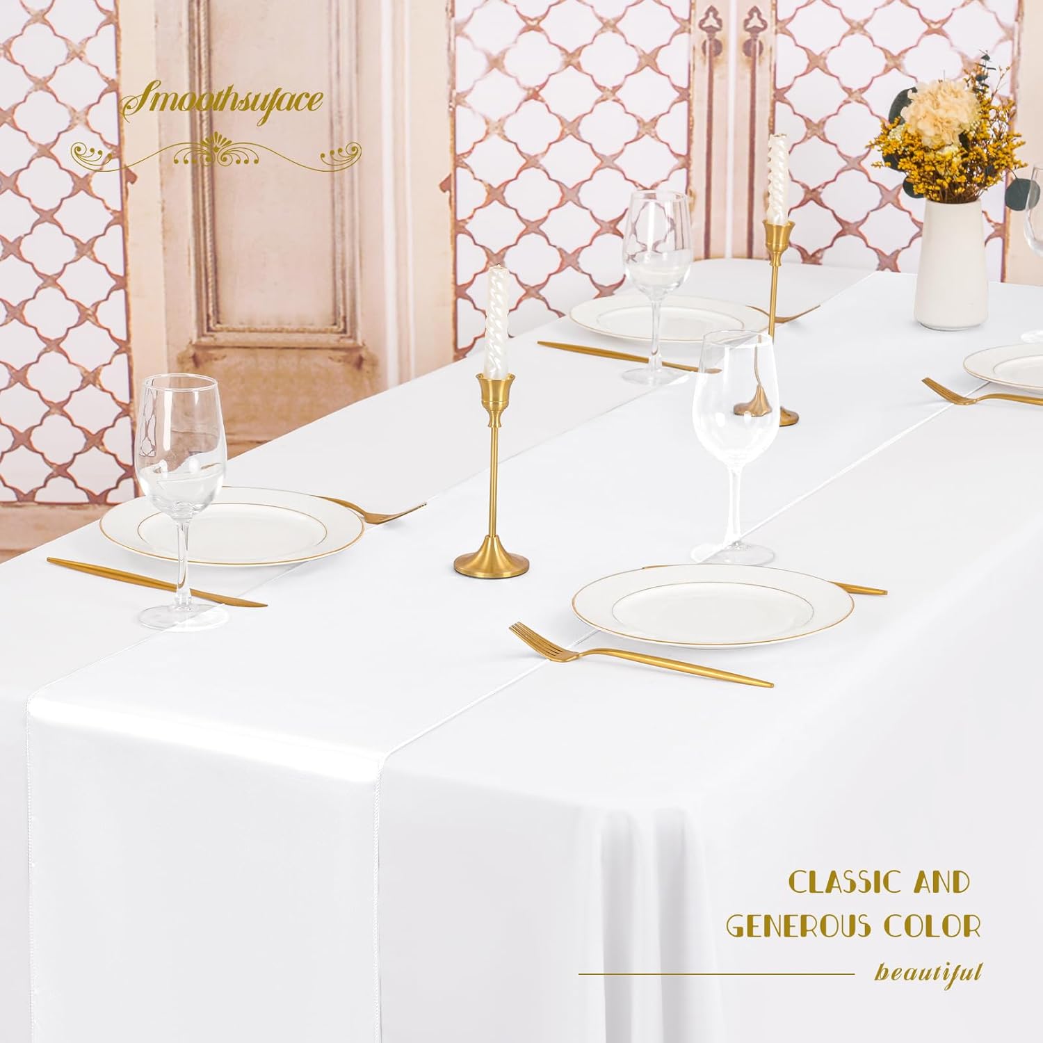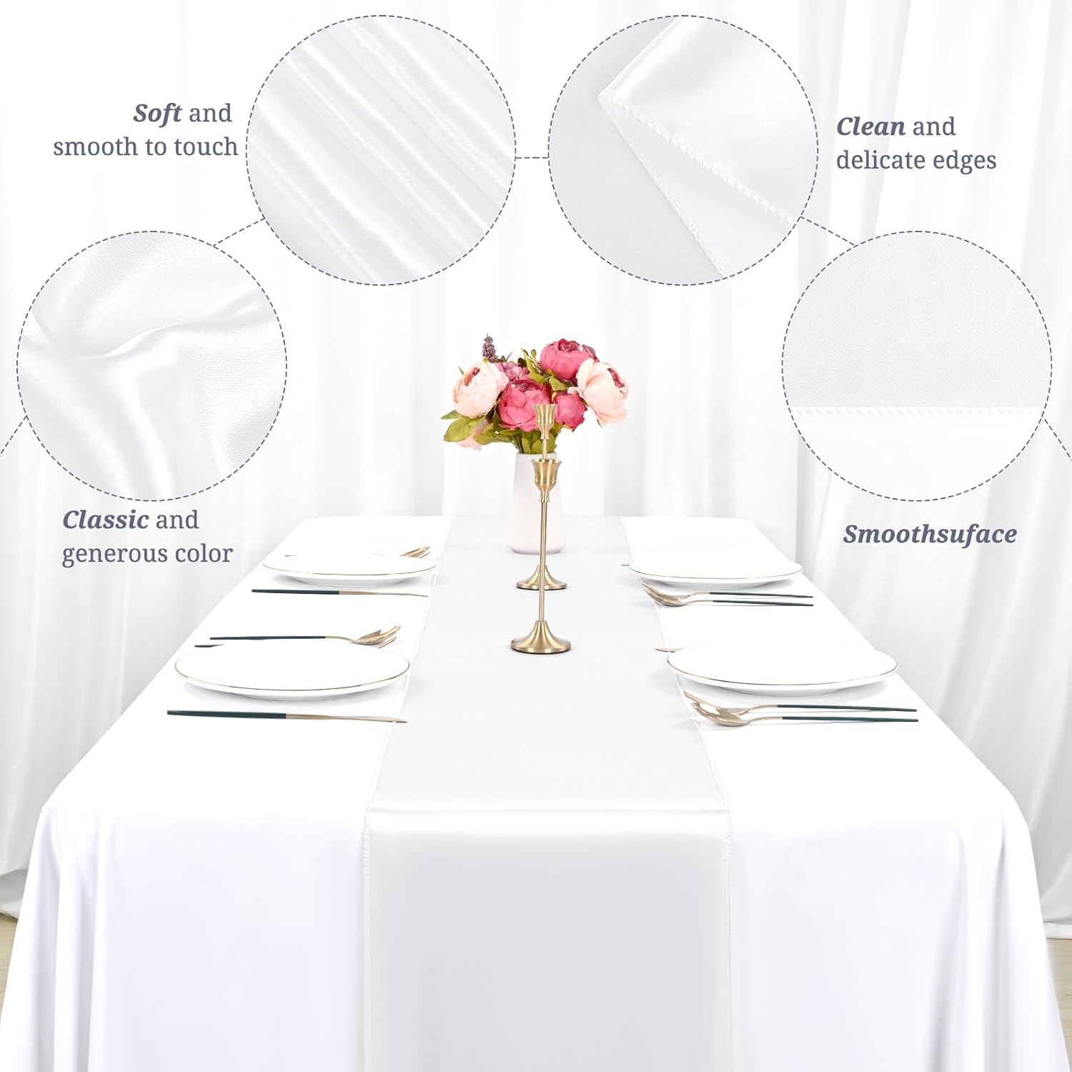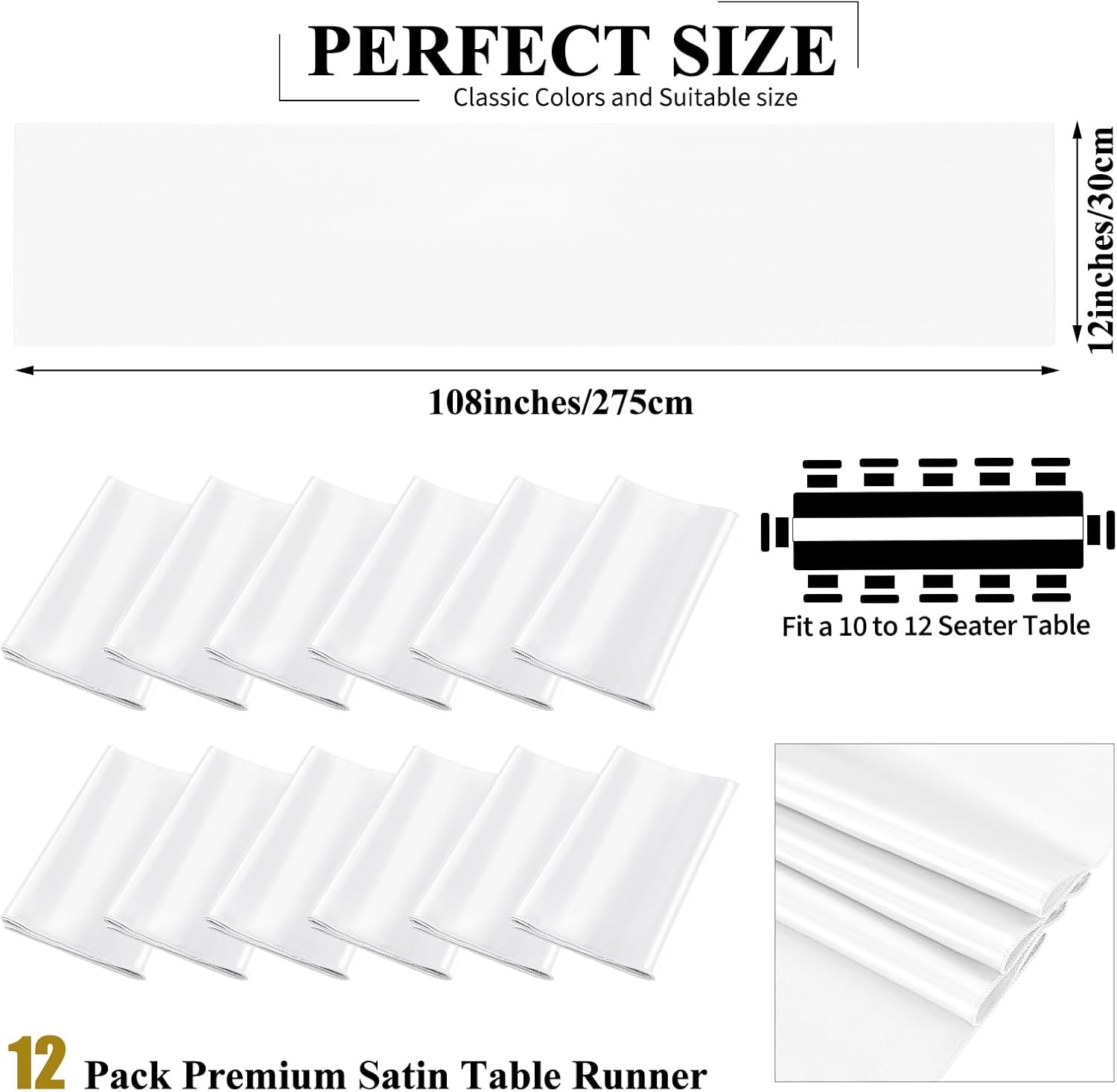 • 🍷【Set includes】12 Pack white satin table runner measures 12" x 108" in size, appropriate for a table that can seat 8-10 people. This satin table runner can fit a 6ft/8ft rectangular table or round table well.This satin table runner is great for event table decorations.Our satin table runner make your dining table more dazzling and outstanding.Purchase our 12piece satin table runner and save even more.