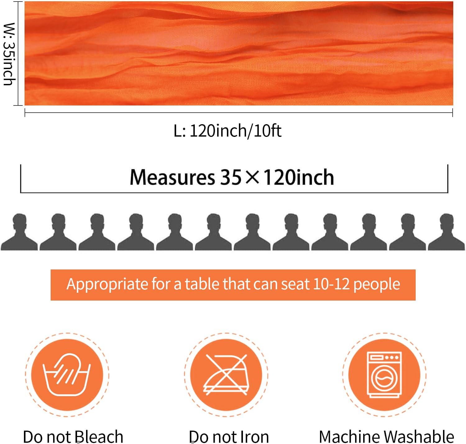 • 🍊【Long Centerpieces for Table】The size of each table runner is approximately 35 x 120 inches / 90 x 300 cm, which is large enough to cover rectangle and round tables, can also be spliced together for long tables. A simple and easy way to dress up a table as wrinkled design no ironing is required & they add a soft touch to your decor! The orange gauze table runner can be compressed, lightweight, and compact, easy to store, more space-saving. You won’t want to miss out on adding this wedding table runner to your dining space. With it every party will bring you giving you romantic and elegant memories.