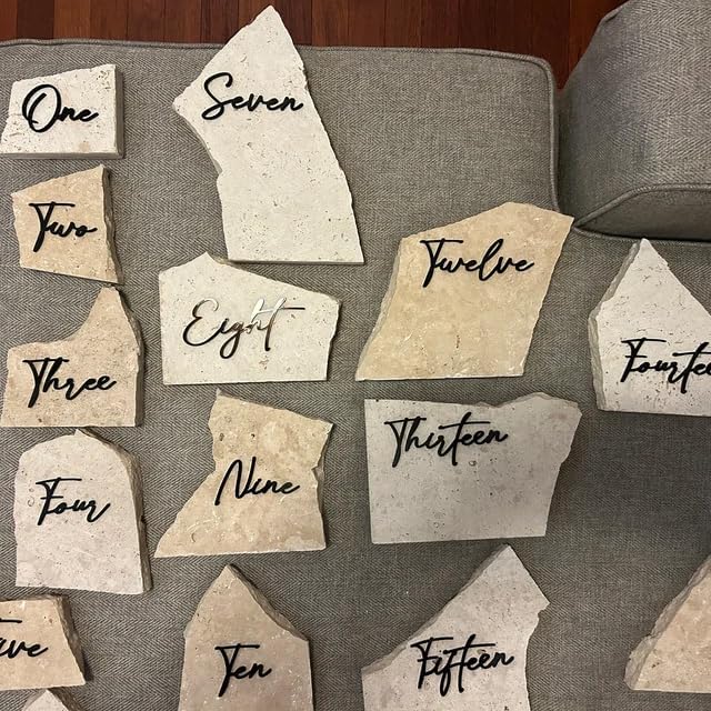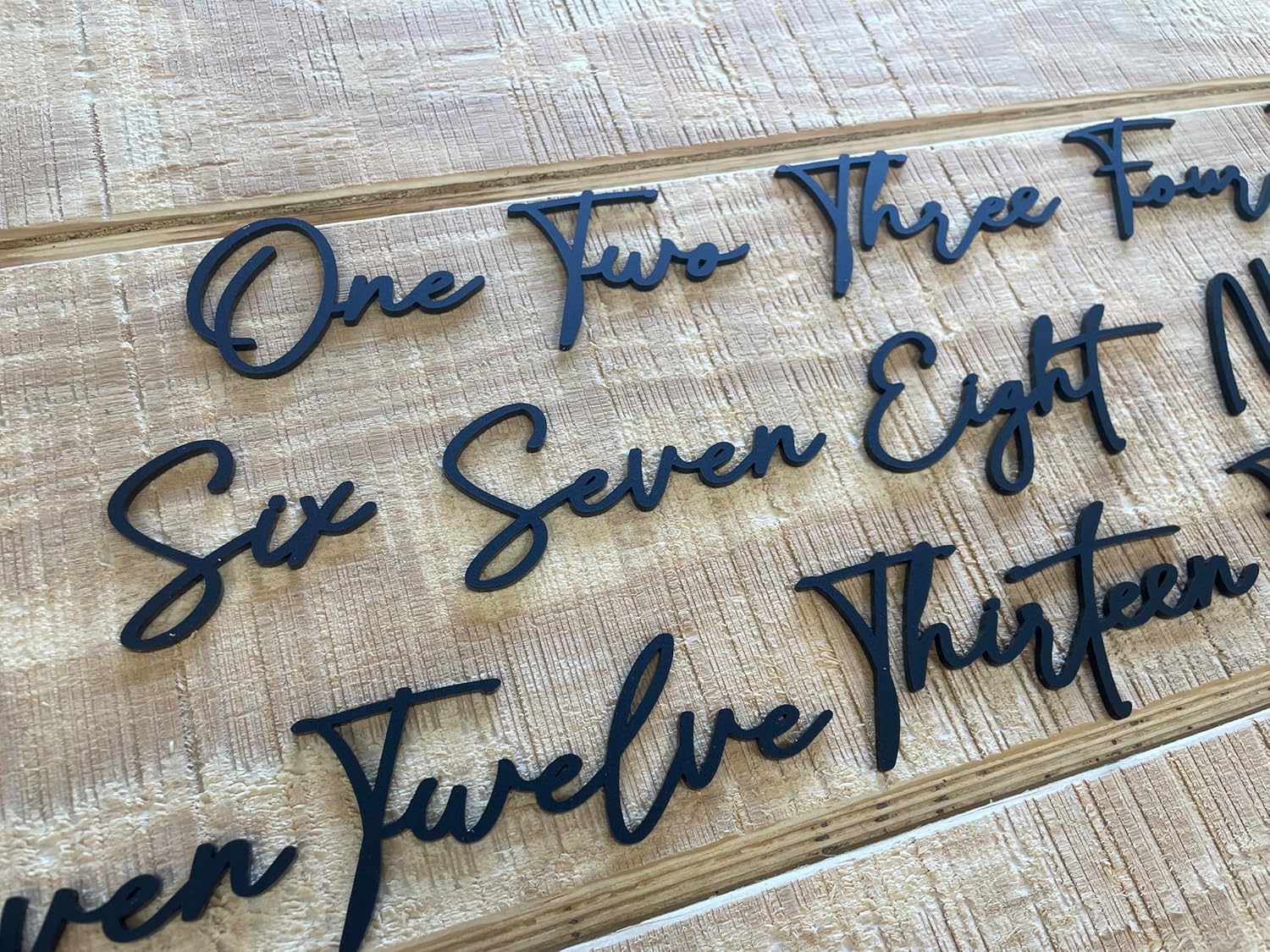 Cursive Wedding Table Number SET, DIY thin modern Black or White acrylic cutouts with silicone glue included. Words only, no backing (One - Five, Matte Black)