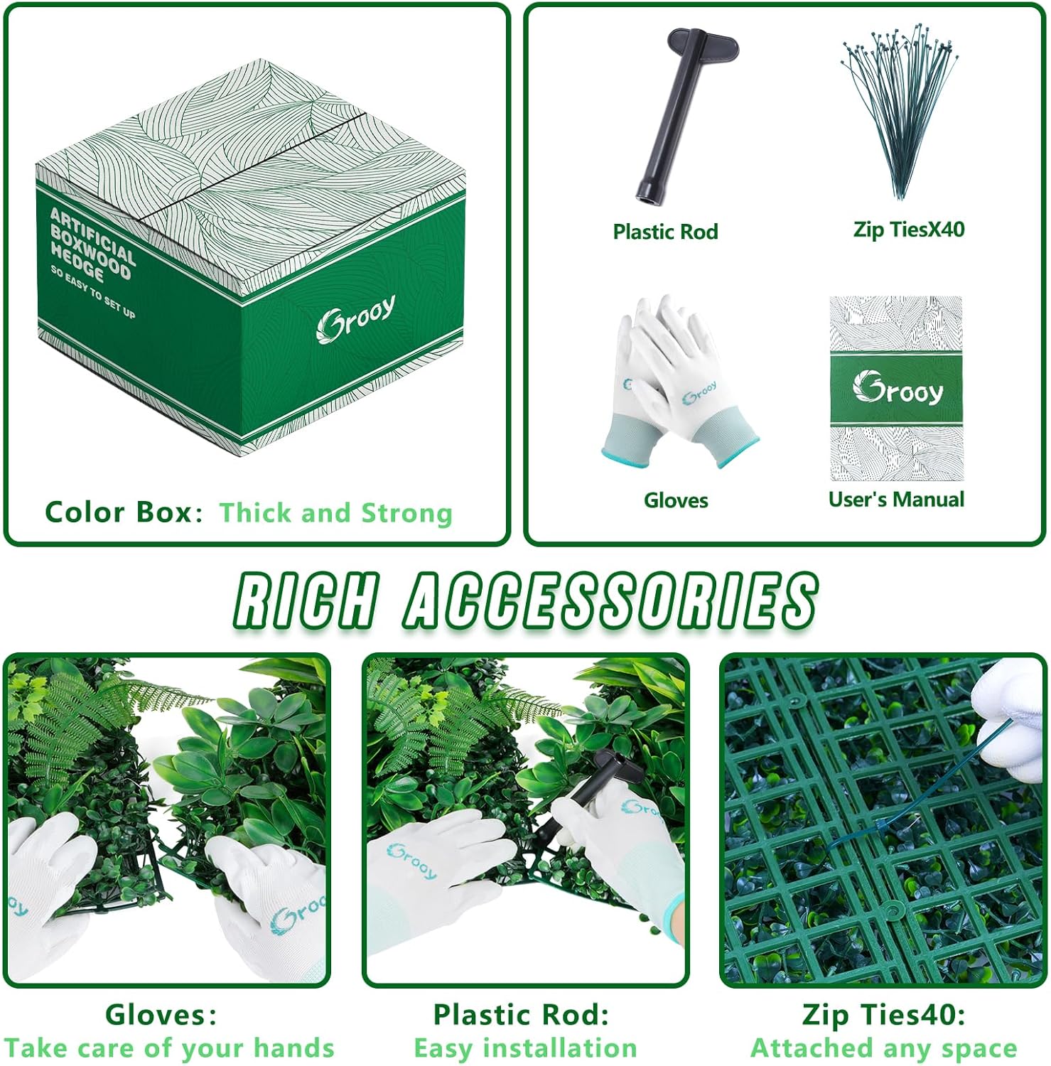 • 🌿【Premium Greenery, Built to Last】Grooy Artificial Boxwood Hedge Panels are made tough, using the latest in High-Density Polyethylene (HDPE). No matter the blazing sun or stormy weather, they'll stay vibrant and lifelike, adding a touch of nature that lasts.