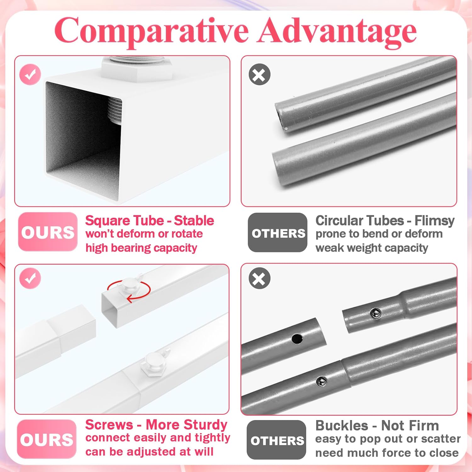 • 【Wedding Arch Frame】This square metal arch backdrop stand is a must-have for your wedding decor. The square arch stand is made of sturdy metallic construction, and its classic square shape will provide you with an amazing background for your party or event. It features square tubes and screw design, laying a solid foundation for your celebration. You can decorate the wedding arch with tulle cloth and vines to create a memorable decoration.