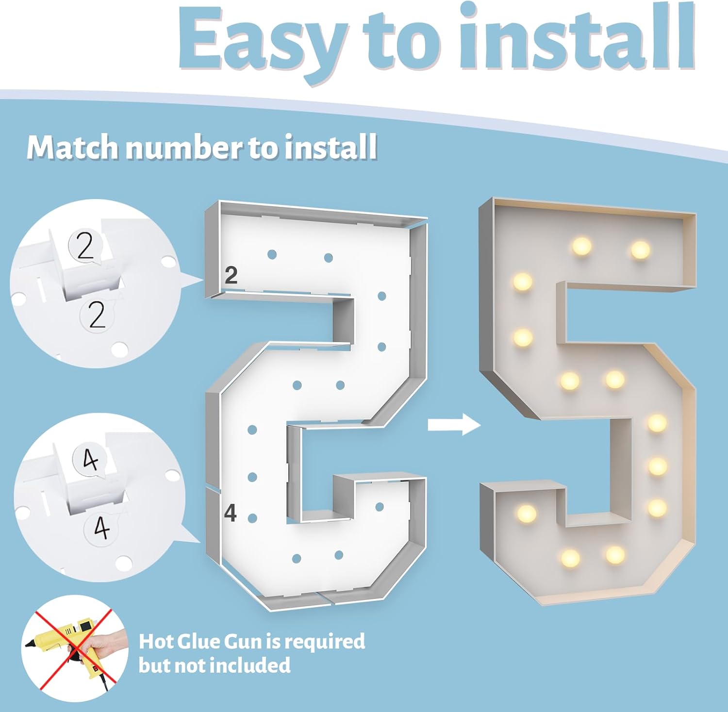 • ASSEMBLY REQUIRED: The marquee numbers need to be assembly with hot glue gun(not included in the package) Assemble it in advance will make your party amazing and fantastic