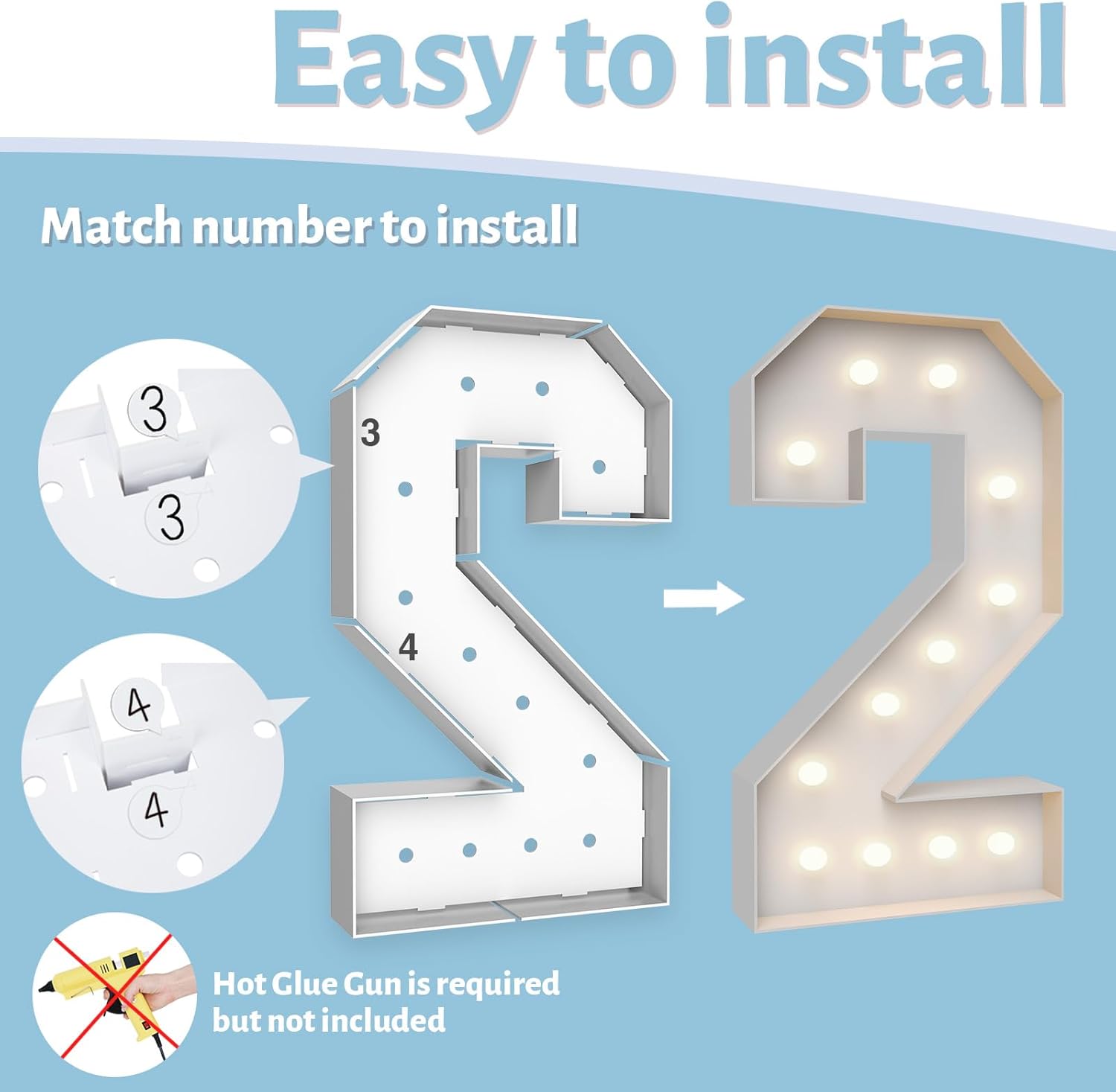 • ASSEMBLY REQUIRED: The marquee numbers need to be assembly with hot glue gun(not included in the package) Assemble it in advance will make your party amazing and fantastic