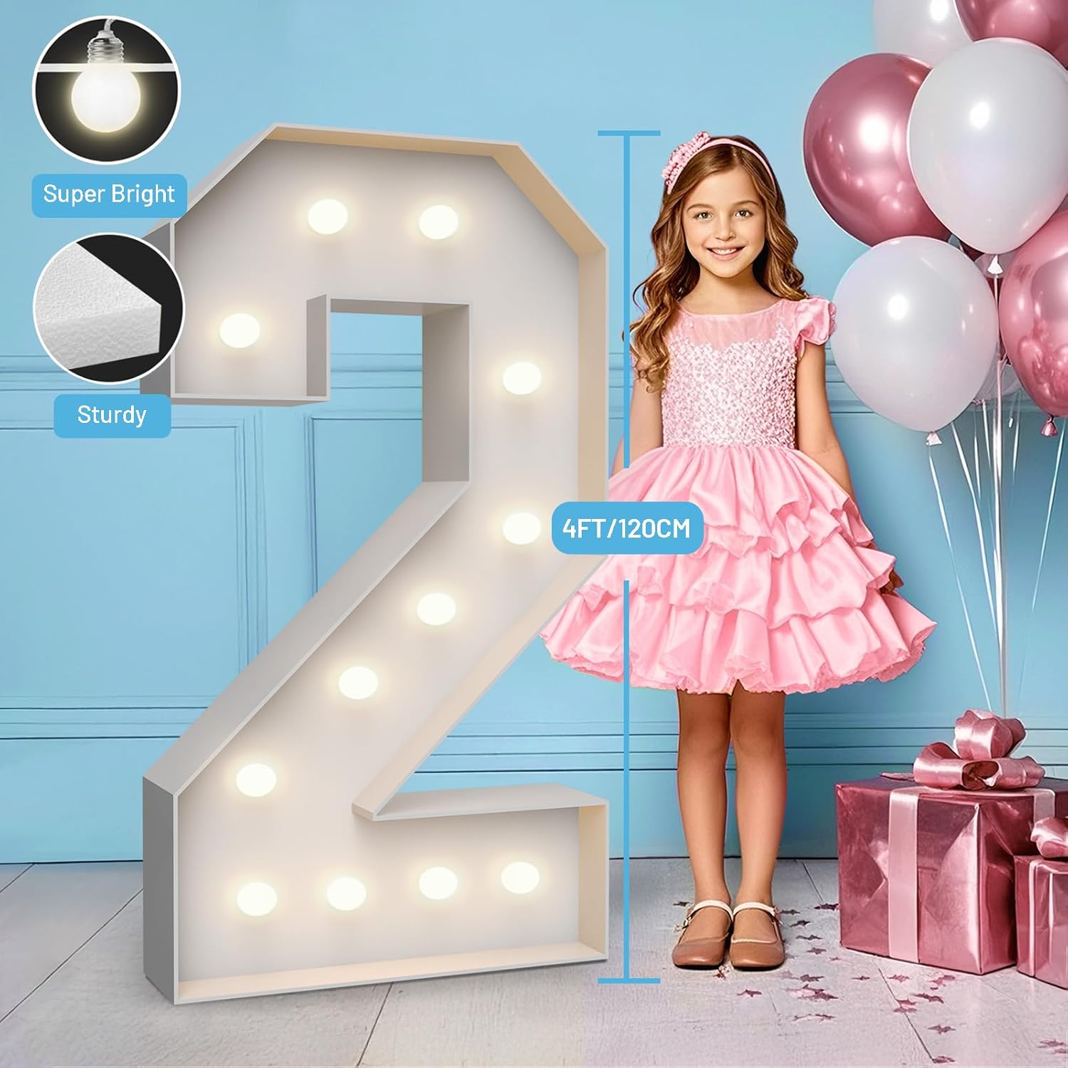 4FT Marquee Light Up Numbers 2,Party Decoration Large Marquee Light Up Letters with Weighted Water Bag,Pre-cut Foam Board Set Can Be Used for Birthdays,Weddings,Baby Anniversaries