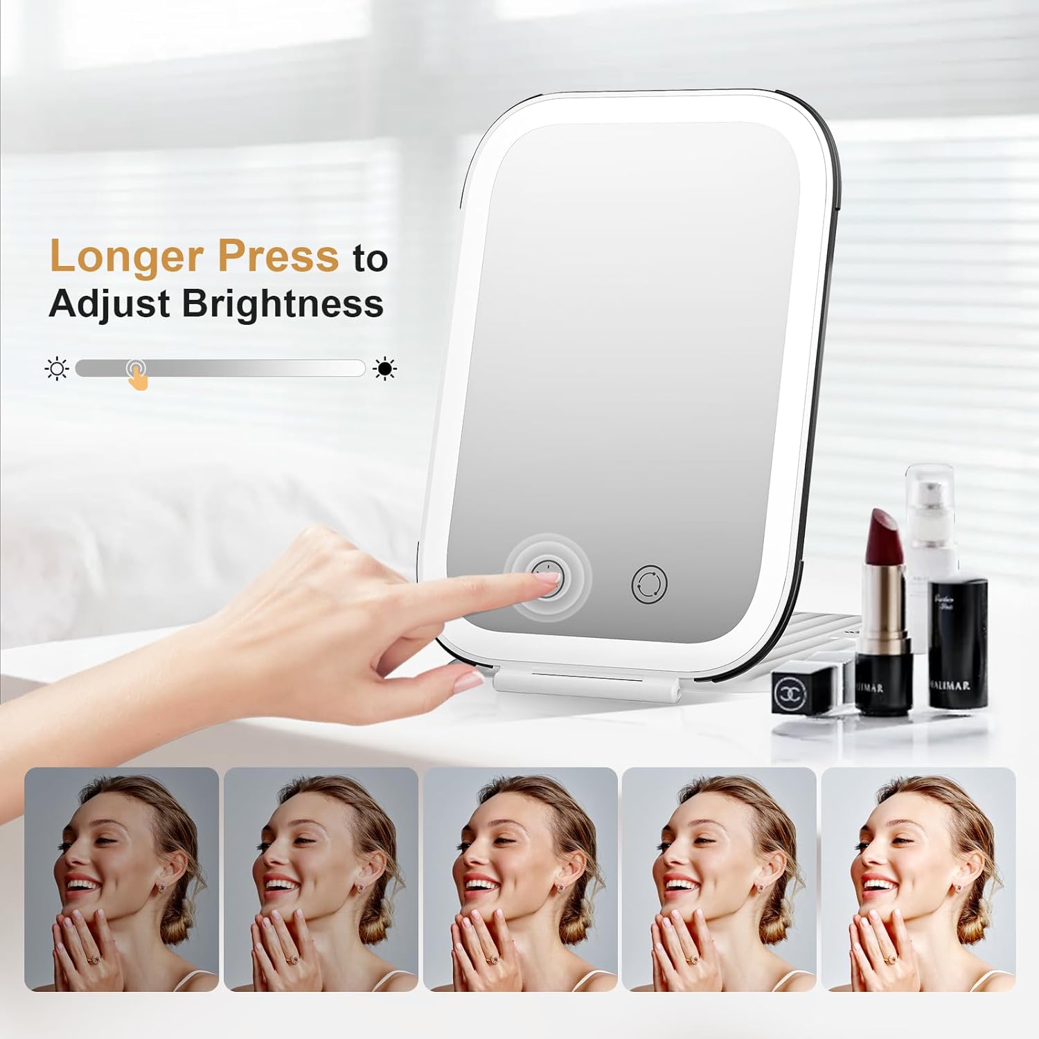 • 3 Color Lighting and Dimmable Touch Screen:This lighted travel makeup mirror with 80 LEDs, offers white lights, warm lights and cool lights. Easily Short Press for color temp between a warm glow to white glow.Longer Press the high-sensitivity touch button can brighten or darken the mirror between 100%, 50% and 10% brightness,just use it at your ease