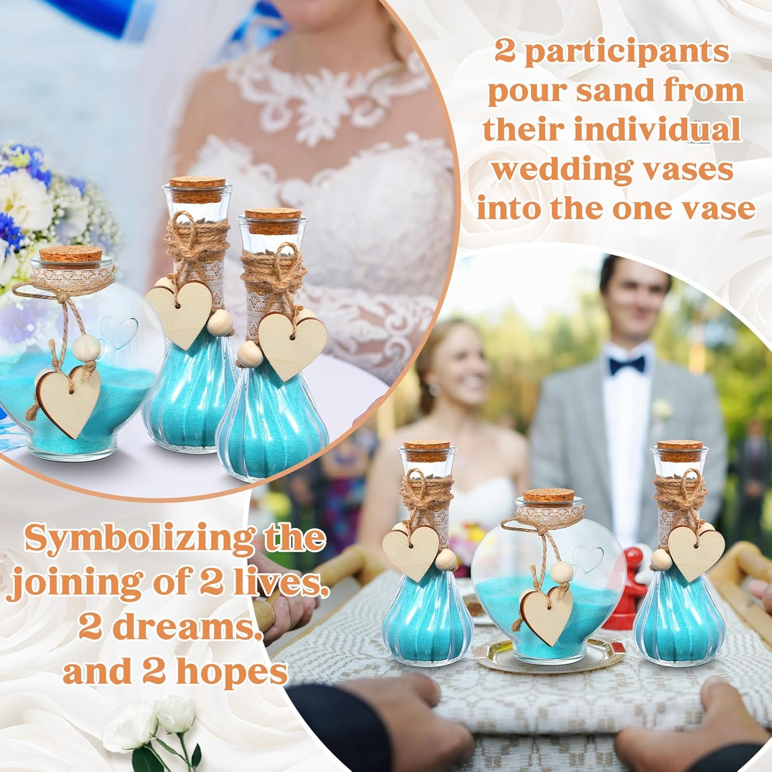 • Symbolic Unity Sand Ceremony: 2 participants pour sand from their individual wedding vases into the one vase, symbolizing the joining of 2 lives, 2 dreams, and 2 hopes; This visual representation of unity and commitment is an ideal addition to your wedding ceremony, reflecting the inseparable nature of marriage
